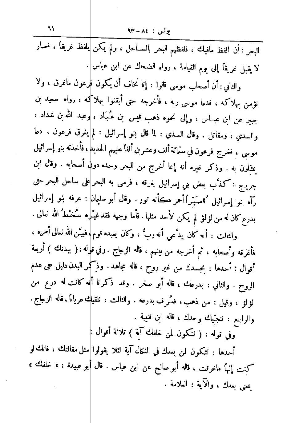 والثاني أن أصحاب موسى قالوا إنا نخاف أن يكون فرعون ما غرق ولا نؤمن بهلاكه فدعا موسى ربه فأخرجه حتى أيقنوا بهلاكه رواه سعيد بن جبير عن ابن عباس وإلى نحوه ذهب قيس بن عباد وعبد الله بن شداد والسدي ومقاتل وقال السدي لما قال بنو إسرائيل لم يغرق فرعون دعا موسى فخرج فرعون في ستمائة الف وعشرين ألفا عليهم الحديد فأخذته بنوا إسرائيل يمثلون به وذكر غيره أنه إنما أخرج من البحر وحده دون أصحابه وقال ابن جريج كذب بعض بني إسرائيل بغرقه فرمى به البحر على ساحل البحر حتى رآه بنوا إسرائيل قصيرا أحمر كأنه ثور وقال أبو سليمان عرفه بنوا إسرائيل بدرع كان له من لؤلؤ لم يكن لأحد مثلها فأما وجهه فقد غيره سخط الله تعالى