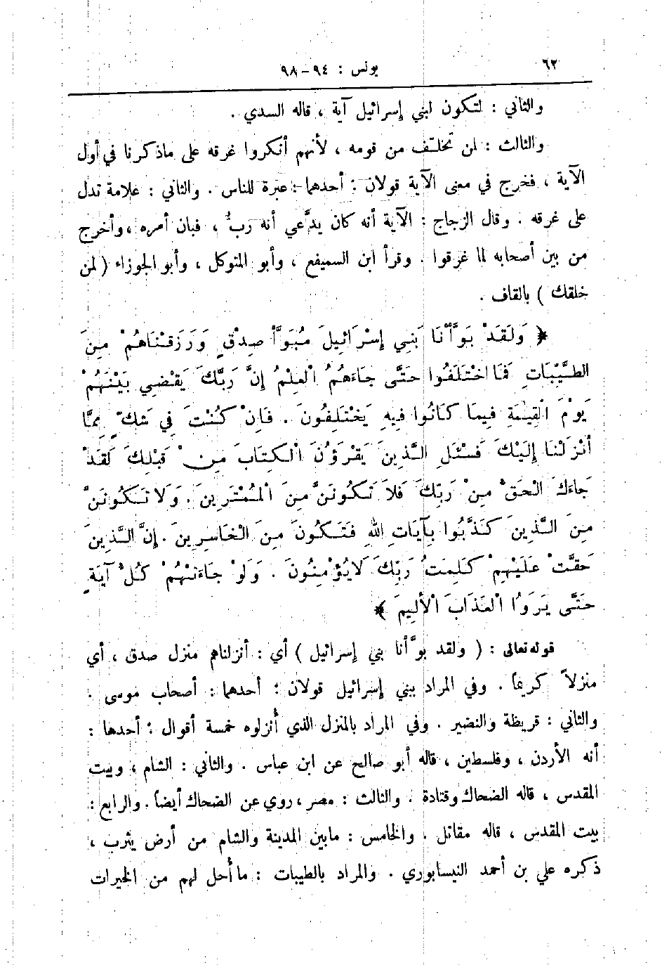 قوله تعالى ولقد بوأنا بني إسرائيل أي أنزلناهم منزل صدق أي منزلا كريما وفي المراد ببني إسرائيل قولان أحدهما أصحاب موسى والثاني قريظة والنضير وفي المراد بالمنزل الذي أنزلوه خمسة أقوال أحدها أنه الأردن وفلسطين قاله أبو صالح عن ابن عباس والثاني الشام وبيت المقدس قاله الضحاك وقتادة والثالث مصر روي عن الضحاك أيضا والرابع بيت المقدس قاله مقاتل والخامس ما بين المدينة والشام من أرض يثرب ذكره علي بن أحمد النيسابوري والمراد بالطيبات ما أحل لهم من الخيرات