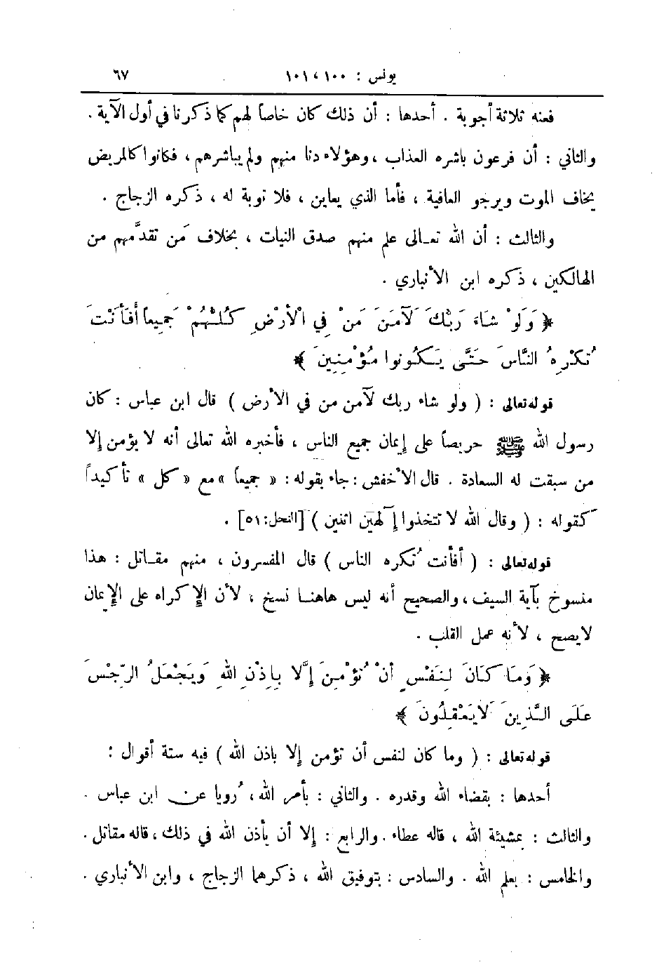 قوله تعالى ولو شاء ربك لآمن من في الأرض قال ابن عباس كان رسول الله صلى الله عليه و سلم حريصا على إيمان جميع الناس فأخبره الله تعالى أنه لا يؤمن إلى من سبقت له السعادة قال الأخفش جاء بقوله جميعا مع كل تأكيدا كقوله وقال الله لا تتخذوا إلهين اثنين النحل 51