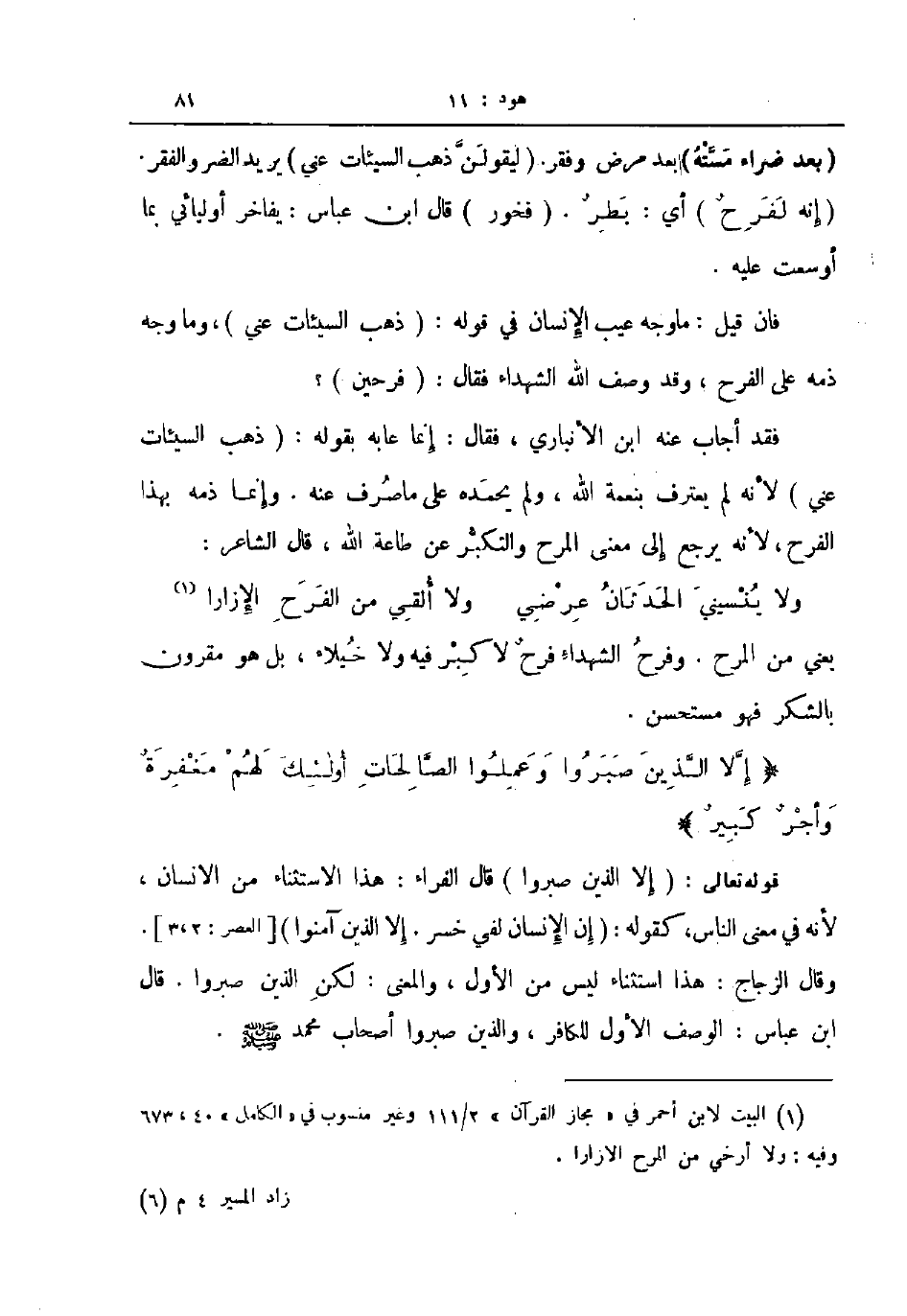 فقد أجاب عنه ابن الأنباري فقال إنما عابه بقوله ذهب السيئات عني لأنه لم يعترف بنعمة الله ولم يحمده على ما صرف عنه وإنما ذمه بهذا الفرح لأنه يرجع إلى معنى المرح والتكبر عن طاعة الله قال الشاعر ... ولا ينسيني الحدثان عرضي ... ولا ألقي من الفرح الإزارا ...