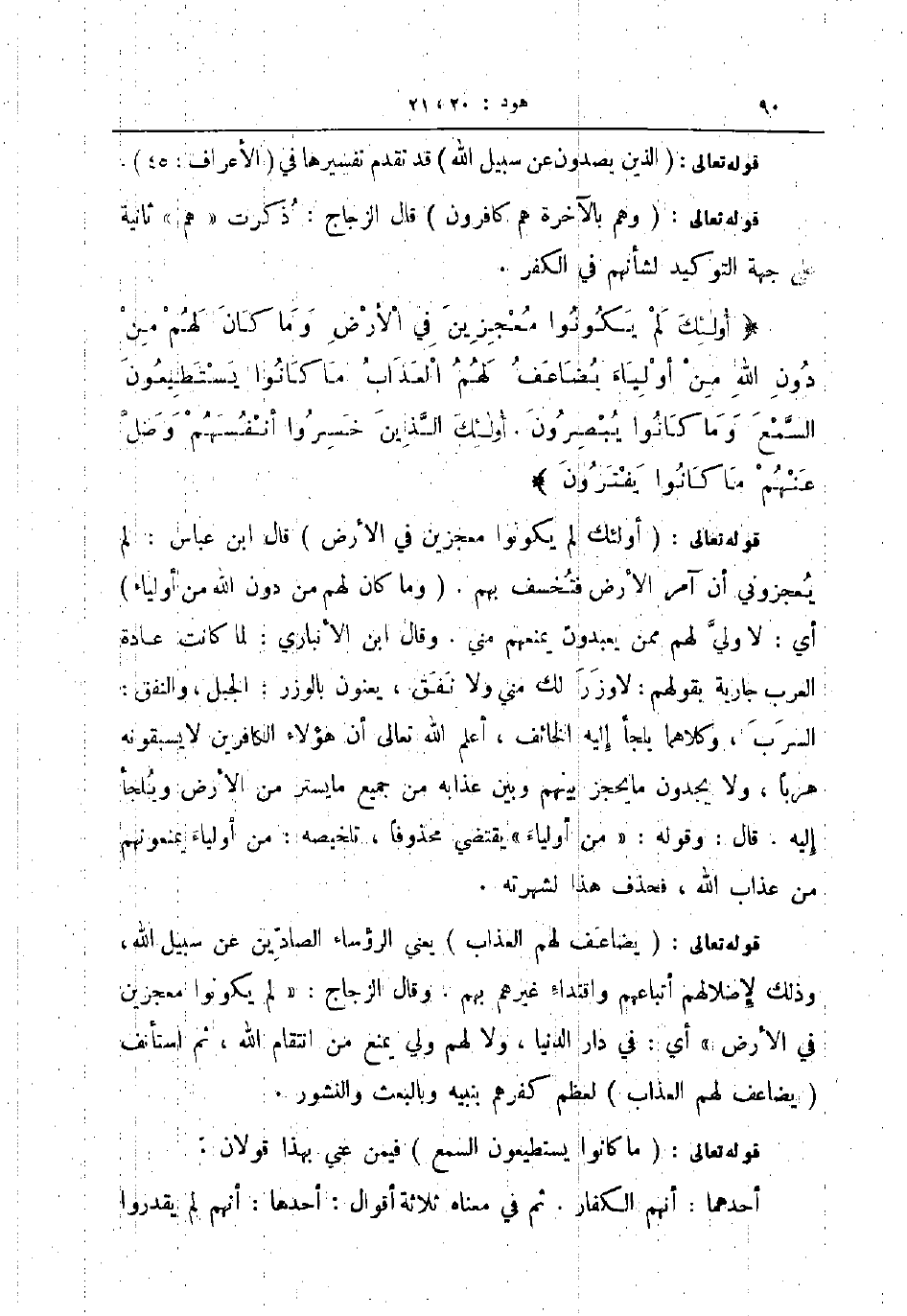 قوله تعالى وهم بالآخرة هم كافرون قال الزجاج ذكرت هم ثانية على جهة التوكيد لشأنهم في الكفر أولئك لم يكونوا معجزين في الأرض وما كان لهم من دون الله من أولياء يضاعف لهم العذاب ما كانوا يستطيعون السمع وما كانوا يبصرون أولئك الذين خسروا أنفسهم وضل عنهم ما كانوا يفترون