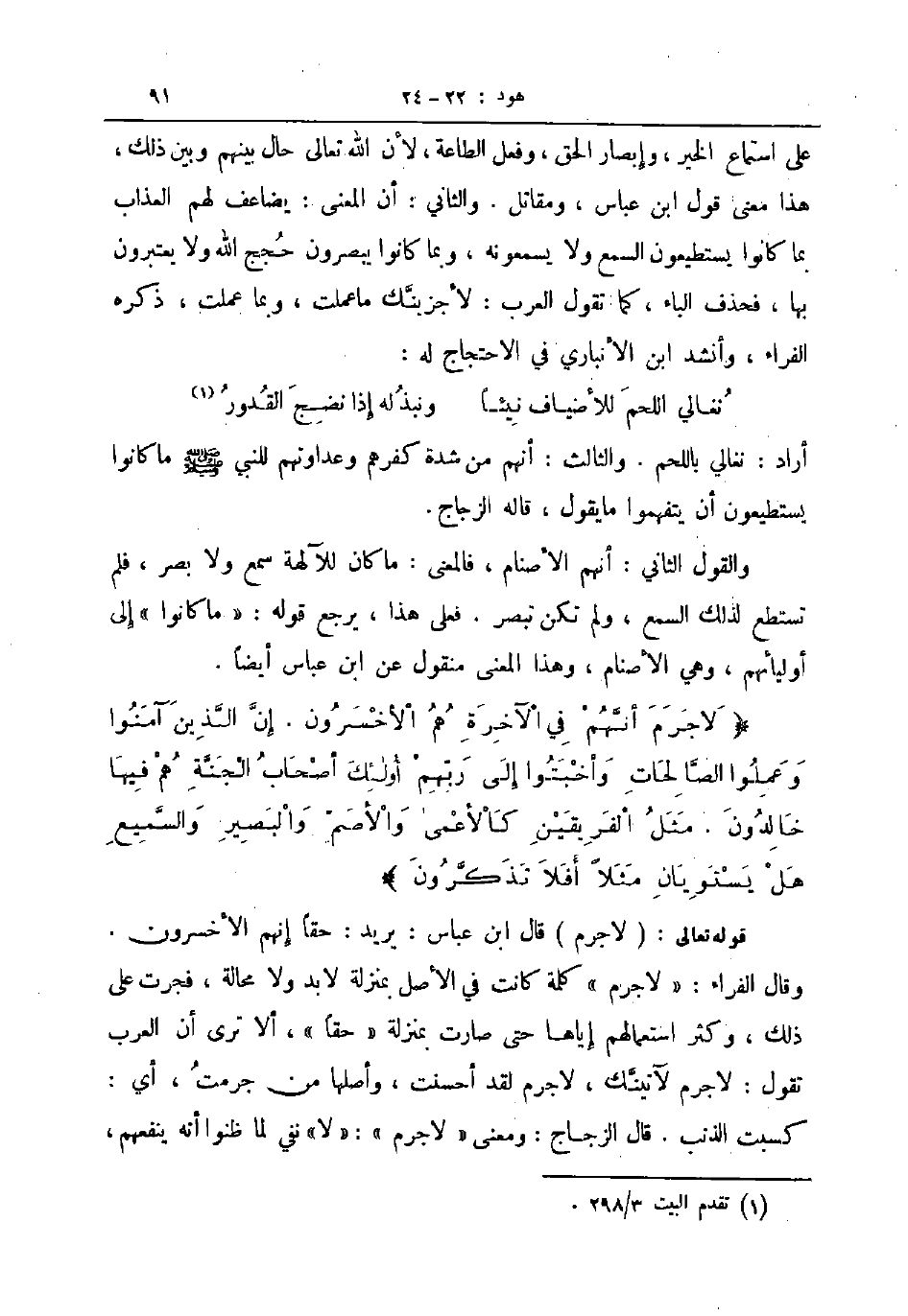 على استماع الخير وإبصار الحق وفعل الطاعة لأن الله تعالى حال بينهم وبين ذلك هذا معنى قول ابن عباس ومقاتل والثاني أن المعنى يضاعف لهم العذاب بما كانوا يستطيعون السمع ولا يسمعونه وبما كانوا يبصورن حجج الله ولا يعتبرون بها فحذف الباء كما تقول العرب لأجزينك ما عملت وبما عملت ذكره الفراء وأنشد ابن الأنباري في الاحتاج له ... نغالي اللحم للأضياف نيئا ... ونبذله إذا نضج القدور ...