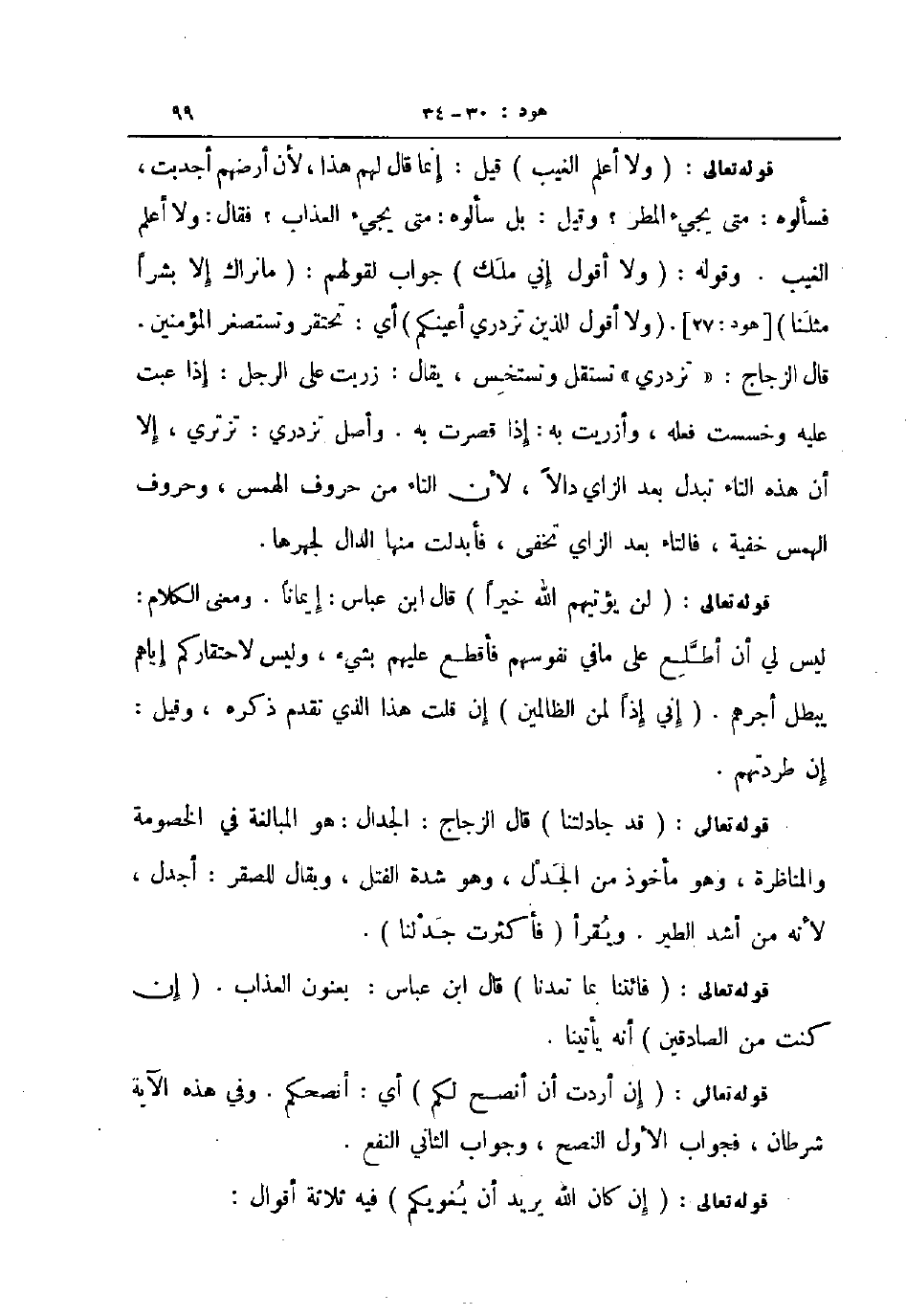 قوله تعالى ولا أعلم الغيب قيل إنما قال لهم هذا لأن أرضهم أجدبت فسألوه متى يجيء المطر وقل بل سالوه متى يجيء العذاب فقال ولا أعلم الغيب وقوله ولا أقول إني ملك جواب لقولهم ما نراك إلا بشرا مثلنا هود 27 و ولا أقول للذين تزدري أعينكم أي تحتقر وتستصغر المؤمنين قال الزجاج تزدري تستقل وتستخس يقال زريت على الرجل إذا عبت عليه وخسست فعله وأزريت به إذا قصرت به وأصل تزدري تزتري إلا أن هذه التاء تبدل بعد الزاي دالا لأن التاء من حروف الهمس وحروف الهمس خفية فالتاء بعد الزاي تخفى فأبدلت منها الدال لجهرها