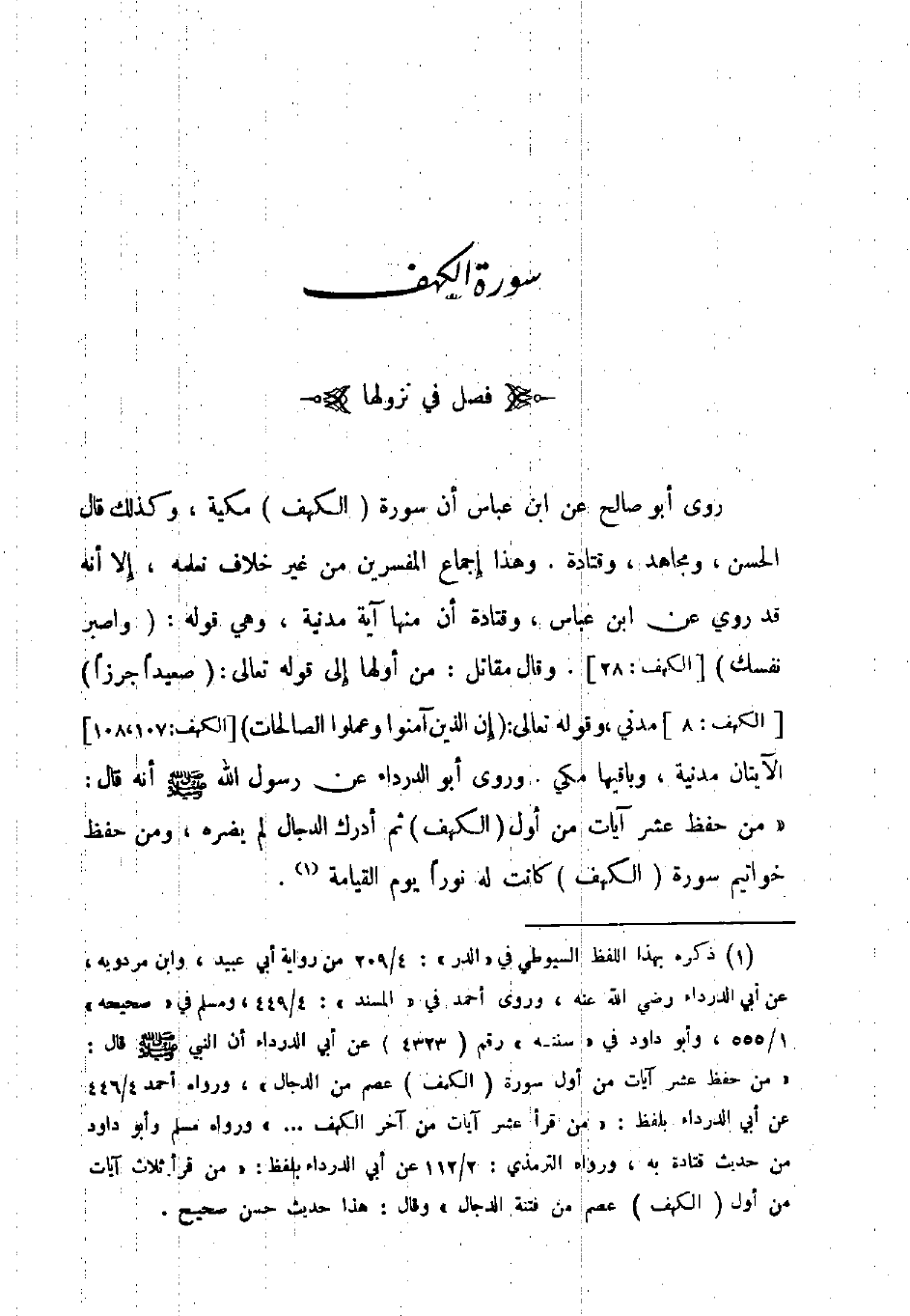روى أبو صالح عن ابن عباس أن سورة الكهف مكية وكذلك قال الحسن ومجاهد وقتادة وهذا اجماع المفسرين من غير خلاف نعلمه إلا أنه قد روي عن ابن عباس وقتادة أن منها آية مدنية وهي قوله واصبر نفسك الكهف 28 وقال مقاتل من أولها الى قوله تعالى صعيدا جرزا الكهف 8 مدني وقوله تعالى ان الذين آمنوا وعملوا الصالحات الكهف 107108 الآيتان مدنية وباقيها مكي وروى أبو الدرداء عن رسول الله صلى الله عليه و سلم أنه قال من حفظ عشر آيات من أول الكهف ثم أدرك الدجال لم يضره ومن حفظ خواتيم سورة الكهف كانت له نورا يوم القيامة