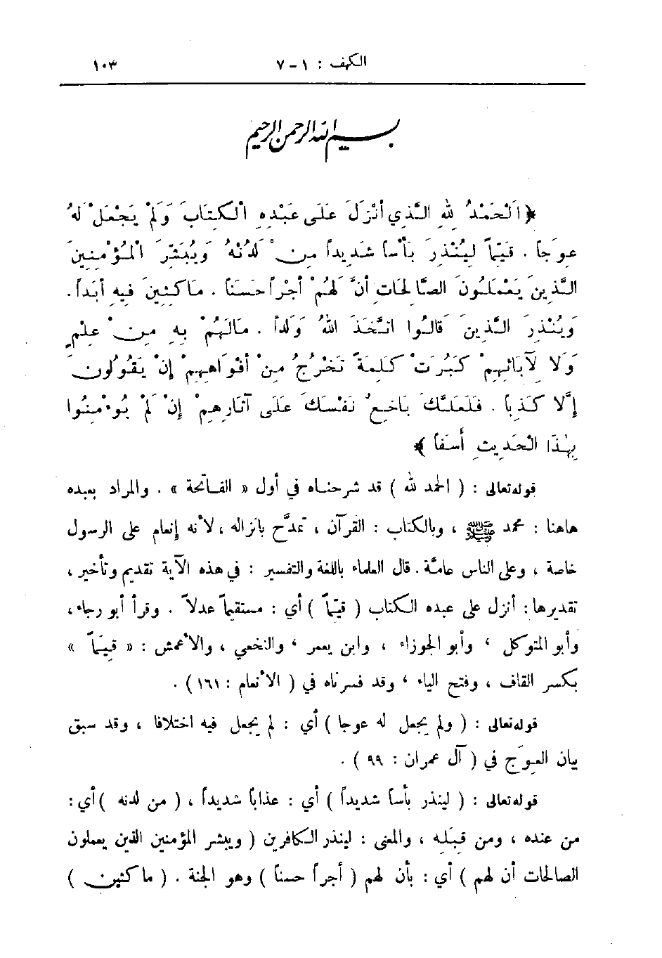 بسم الله الرحمن الرحيم الحمد لله الذي أنزل على عبده الكتاب ولم يجعل له عوجا قيما لينذر بأسا شديدا من لدنه ويبشر المؤمنين الذين يعملون الصالحات أن لهم اجرا حسنا ماكثين فيه أبدا وينذر الذين قالوا اتخذ الله ولدا مالهم به من علم ولا لآبائهم كبرت كلمة تخرج من أفواههم إن يقولون إلا كذبا فلعلك باخع نفسك على آثارهم إن لم يؤمنوا بهذا الحديث أسفا