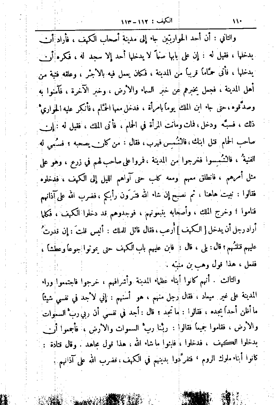 والثاني أن أحد الحواريين جاء الى مدينة أصحاب الكهف فأراد أن يدخلها فقيل له إن على بابها صنما لا يدخلها أحد الا سجد له فكره أن يدخلها فأتى حماما قريبا من المدينة فكان يعمل فيه بالأجر وعلقه فتية من أهل المدينة فجعل يخبرهم عن خبر السماء والأرض وخبر الآخرة فآمنوا به وصدقوه حتى جاء ابن الملك يوما بامرأة فدخل معها الحمام فأنكر عليه الحواري ذلك فسبه ودخل فمات وماتت المرأة في الحمام فأتى الملك فقيل له إن صاحب الحمام قتل ابنك فالتمس فهرب فقال من كان يصحبه فسمي له الفتية فالتمسوا فخرجوا من المدينة فمروا على صاحب لهم في زرع وهو على مثل أمرهم فانطلق معهم ومعه كلب حتى آواهم الليل الى الكهف فدخلوه فقالوا نبيت هاهنا ثم نصبح ان شاء الله فترون رأيكم فضرب الله على آذانهم فناموا وخرج الملك وأصحابه يتبعونهم فوجدوهم قد دخلوا الكهف فكلما أراد رجل أن يدخل الكهف ارعب فقال قائل للملك أليس قلت إن قدرت عليهم قتلتهم قال بلى قال فابن عليهم باب الكهف حتى يموتوا جوعا وعطشا ففعل هذا قول وهب بن منبه