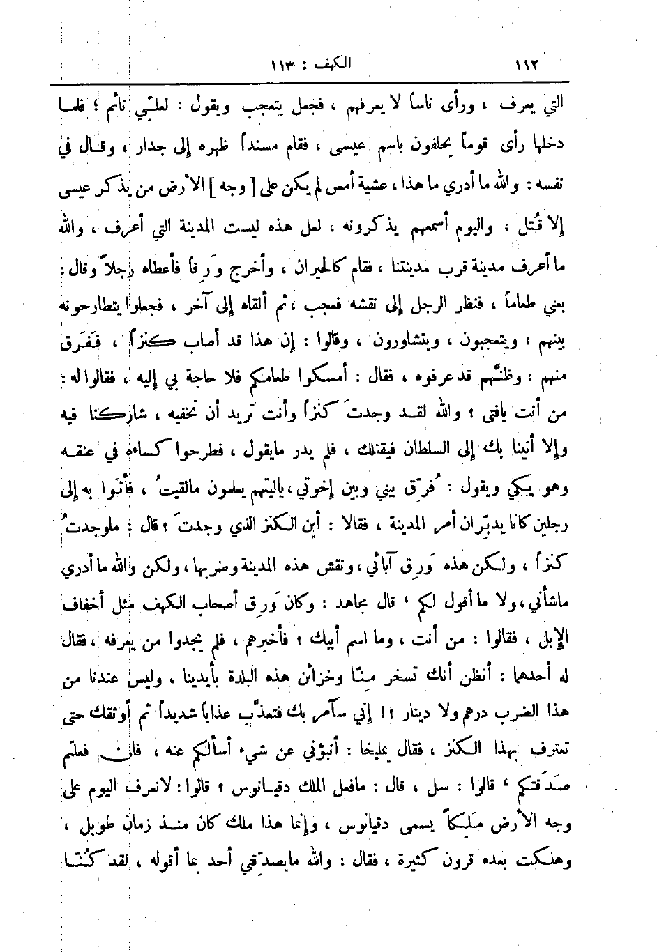 التي يعرف ورأى ناسا لا يعرفهم فجعل يتعجب ويقول لعلي نائم فلما دخلها رأى قوما يحلفون باسم عيسى فقام مسندا ظهره إلى جدار وقال في نفسه والله ما أدري ما هذا عشية أمس لم يكن وجه الأرض من يذكر عيسى إلا قتل واليوم أسمعهم يذكرونه لعل هذه ليست المدينة التي أعرف والله ما أعرف مدينة قرب مدينتنا فقام كالحيران وأخرج ورقا فأعطاه رجلا وقال بعني طعاما فنظر الرجل إلى نقشه فعجب ثم ألقاه إلى آخر فجعلوا يتطارحونه بينهم ويتعجبون ويتشاورون وقالوا إن هذا قد اصاب كنزا ففرق منهم وظنهم قد عرفوه فقال أمسكوا طعامكم فلا حاجة بي إليه فقالوا له من أنت يا فتى والله لقد وجدت كنزا وأنت تريد أن تخفيه شاركنا فيه وإلا أتينا بك إلى السلطان فيقتلك فلم يدر ما يقول فطرحوا كساءه في عنقه وهو يبكي ويقول فرق بيني وبين إخوتي يا ليتهم يعلمون ما لقيت فأتوا به إلى رجلين كانا يدبران أمر المدينة فقالا أين الكنز الذي وجدت قال ما وجدت كنزا ولكن هذه ورق آبائي ونقش هذه المدينة وضربها ولكن والله ما أدري ما شأني ولا ما أقول لكم قال مجاهد وكان ورق أصحاب الكهف مثل أخفاف الإبل فقالوا من أنت وما اسم أبيك فأخبرهم فلم يجدوا من يعرفه فقال له أحدهما أتظن أنك تسخر منا وخزائن هذه البلدة بأيدينا وليس عندنا من هذا الضرب درهم ولا دينار إني سآمر بك فتعذب عذابا شديدا ثم أوثقك حتى تعترف بهذا الكنز فقال يمليخا أنبؤني عن شيء اسالكم عنه فان فعلتم صدقتكم قالوا سل قال ما فعل الملك دقيانوس قالوا لا نعرف اليوم على وجه الارض ملكا يسمى دقيانوس وإنما هذا ملك كان منذ زمان طويل وهلكت بعده قرون كثيرة فقال والله ما يصدقني أحد بما اقوله لقد كنا