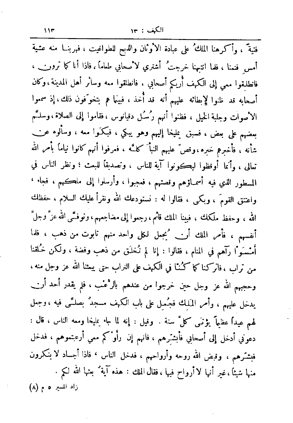 فتية وأكرهنا الملك على عبادة الأوثان والذبح للطواغيت فهربنا منه عشية أمس فنمنا فلما انتبهنا خرجت أشتري لأصحابي طعاما فإذا أنا كما ترون فانطلقوا معي إلى الكهف أريكم أصحابي فانطلقوا معه وسائر أهل المدينة وكان أصحابه قد ظنوا لإبطائه عليهم أنه قد أخذ فبينما هم يتخوفون ذلك إذ سمعوا الأصوات وجلبة الخيل فظنوا أنهم رسل دقيانوس فقاموا إلى الصلاة وسلم بعضهم على بعض فسبق يمليخا إليهم وهو يبكي فبكوا معه وسألوه عن شأنه فأخبرهم خبره وقص عليهم النبأ كله فعرفوا أنهم كانوا نياما بأمر الله تعالى وإنما أوقظوا ليكونوا آية للناس وتصديقا للبعث ونظر الناس في المسطور الذي فيه أسماؤهم وقصتهم فعجبوا وأرسلوا إلى ملكهم فجاء واعتنق القوم وبكى فقالوا له نستودعك الله ونقرأ عليك السلام حفظك وحفظ ملكك فبينا الملك قائم رجعوا إلى مضاجعهم وتوفى الله عز و جل أنفسهم فامر الملك أن يجعل لكل واحد منهم تابوت من ذهب فلما أمسوا رآهم في المنام فقالوا إنا لم نخلق من ذهب وقضة ولكن خلقنا من تراب فاتركنا كما كنا في الكهف على التراب حتى يبعثنا الله عز و جل من وحجبهم الله عز و جل حين خرجوا من عندهم بالرعب فلم يقدر أحد أن يدخل عليهم وأمر الملك فجعل على باب الكهف مسجد يصلى فيه وجعل لهم عيدا عظيما يؤتى كل سنة وقيل إنه لما جاء يمليخا ومعه الناس قال دعوني أدخل إلى أصحابي فأبشرهم فانهم إن رأوكم معي أرعبتموهم فدخل فبشرهم وقبض الله روحه وأرواحهم فدخل الناس فاذا أجساد لا ينكرون منها شيئا غير أنها لا أرواح فيها فقال الملك هذه آية بعثها الله لكم