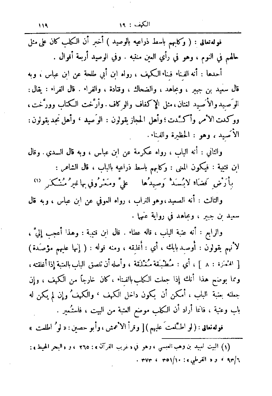 أحدها أنه الفناء فناء الكهف رواه ابن أبي طلحة عن ابن عباس وبه قال سعيد بن جبير ومجاهد والضحاك وقتادة والفراء قال الفراء يقال الوصيد والأصيد لغتان مثل الإكفاف والوكاف وأرخت الكتاب وورخت ووكدت الأمر وأكدت وأهل الحجاز يقولون الوصيد وأهل نجد يقولون الأصيد وهو الحظيرة والفناء