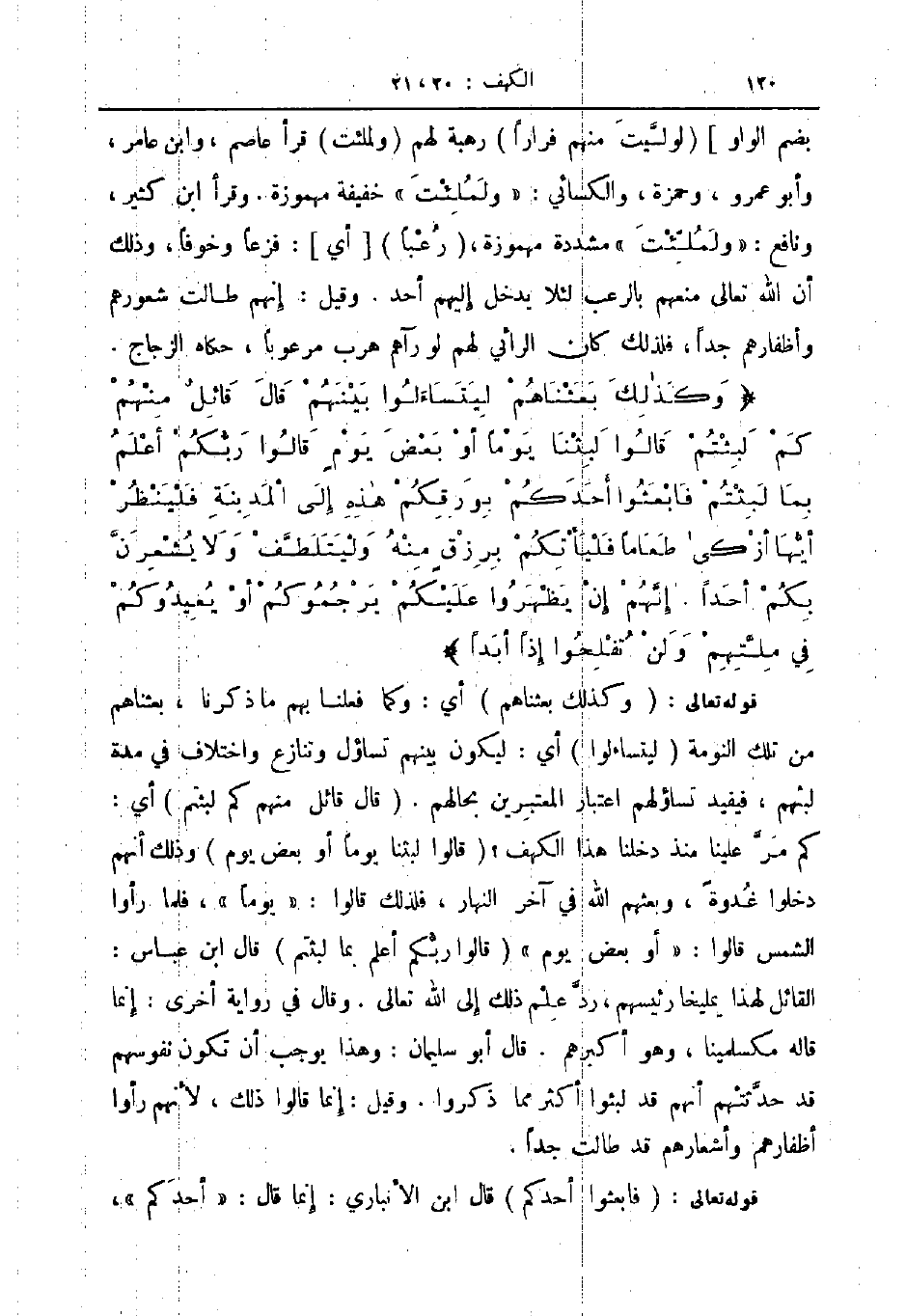 وكذلك بعثناهم ليتساءلوا بينهم قال قائل منهم كم لبثتم قالوا لبثنا يوما أو بعض يوم قالوا ربكم أعلم بما لبثتم فابعثوا أحدكم بورقكم هذه إلى المدينة فلينظر أيها ازكى طعاما فليأتكم برزق منه وليتلطف ولا يشعرن بكم أحدا إنهم إن يظهروا عليكم يرجموكم أو يعيدوكم في ملتهم ولن تلفحوا إذا أبدا