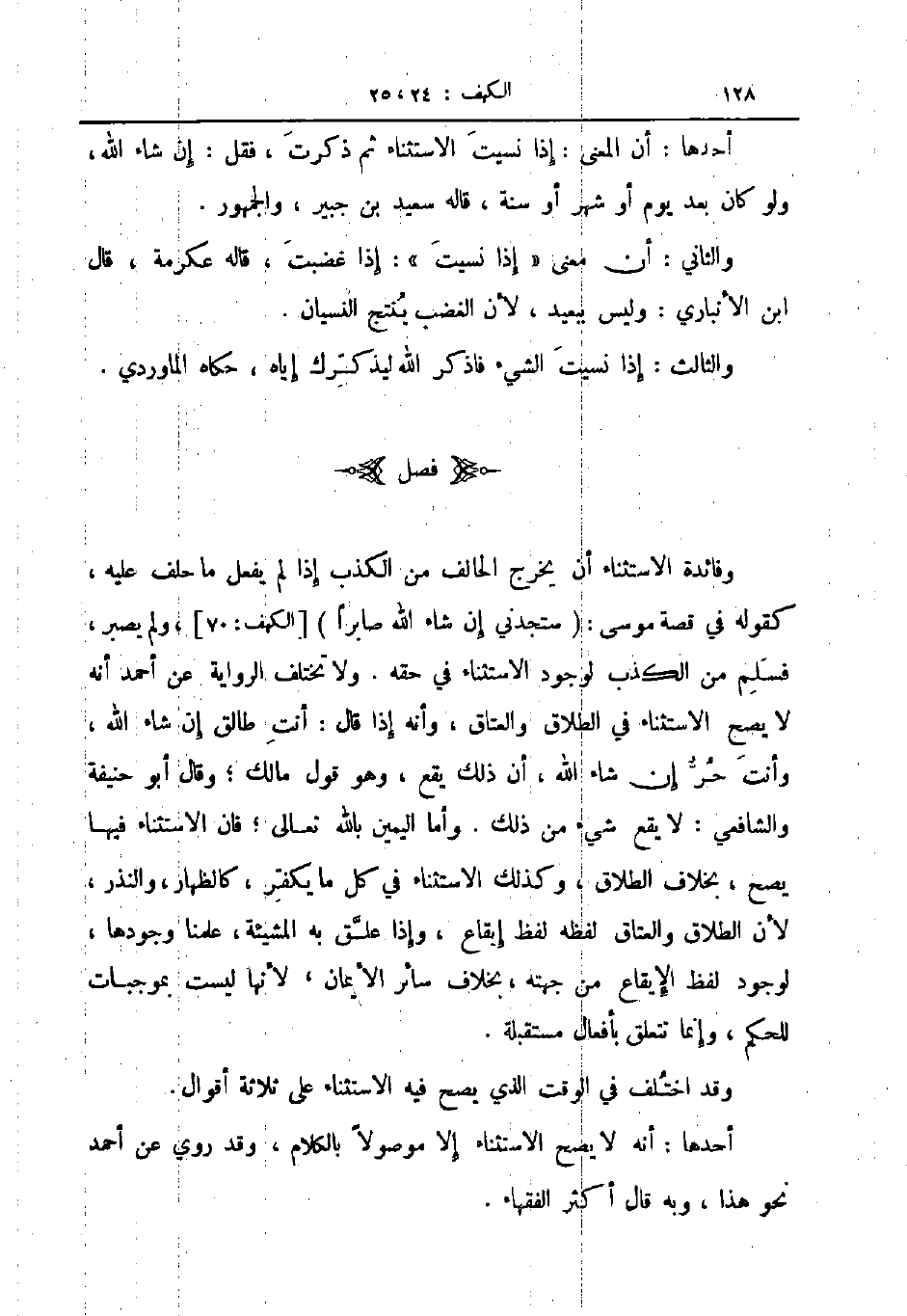 وفائدة الاستثناء أن يخرج الحالف من الكذب إذا لم يفعل ما حلف عليه كقوله في قصة موسى ستجدني إن شاء الله صابرا الكهف 70 ولم يصبر فسلم من الكذب لوجود الاستثناء في حقه ولا تختلف الرواية عن أحمد أنه لا يصح الاستثناء في الطلاق والعتاق وأنه إذا قال انت طالق ان شاء الله وانت حر إن شاء الله أن ذلك يقع وهو قول مالك وقال أبو حنيفة والشافعي لا يقع شيء من ذلك وأما اليمين بالله تعالى فان الاستثناء فيها يصح بخلاف الطلاق وكذلك الاستثناء في كل ما يكفر كالظهار والنذر لأن الطلاق والعتاق لفظه لفظ إيقاع وإذا علق به المشيئة علمنا وجودها لوجود لفظ الإيقاع من جهته بخلاف سائر الايمان لأنها ليست بموجبات للحكم وإنما تتعلق بأفعال مستقبلة