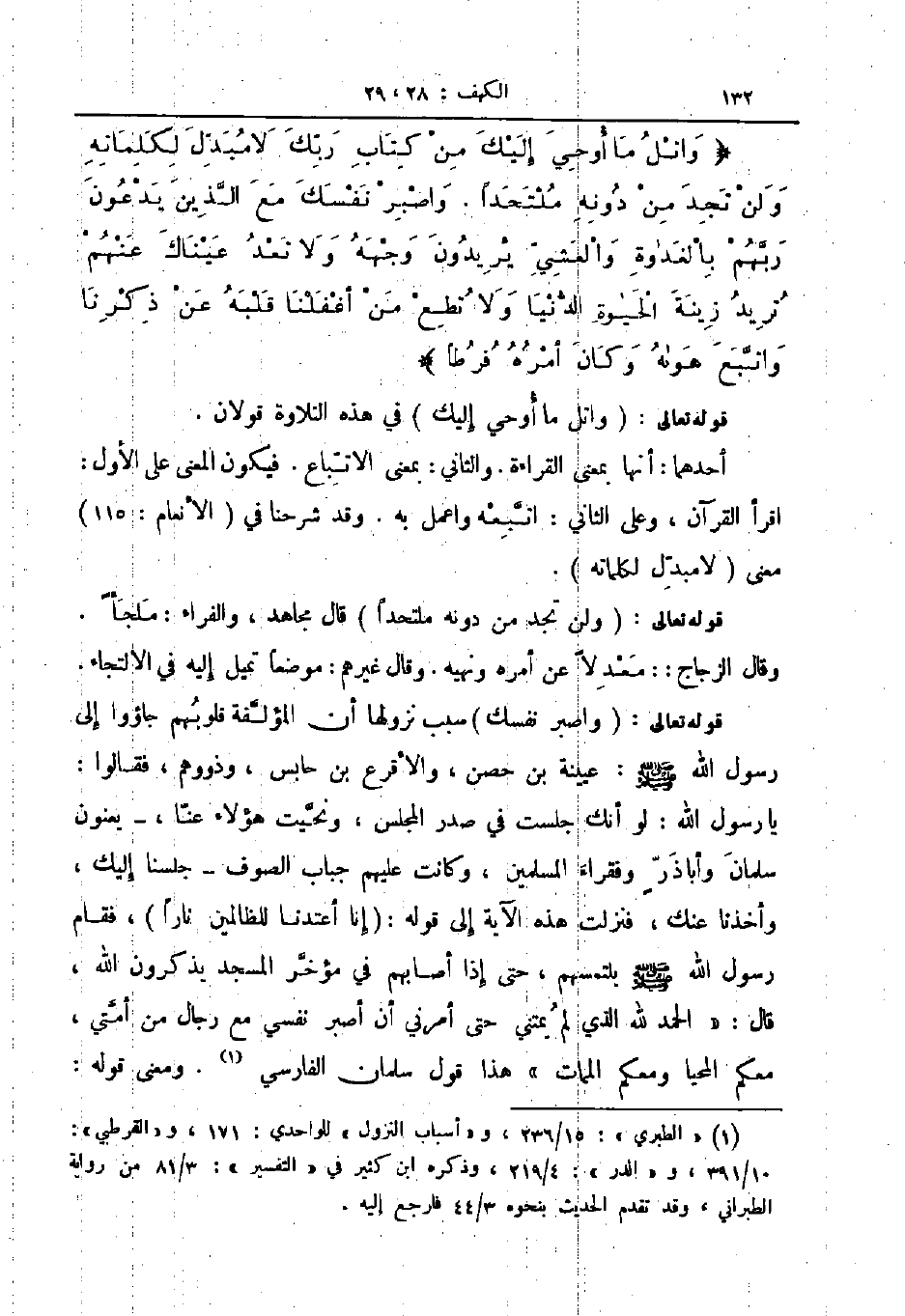 واتل ما أوحي إليك من كتاب ربك لا مبدل لكلماته ولن تجد من دونه ملتحدا واصبر نفسك مع الذين يدعون ربهم بالغدوة والعشي يريدون وجهه ولا تعد عيناك عنهم تريد زينة الحيوة الدنيا ولا تطع من أغفلنا قلبه عن ذكرنا واتبع هوايه وكان امره فرطا