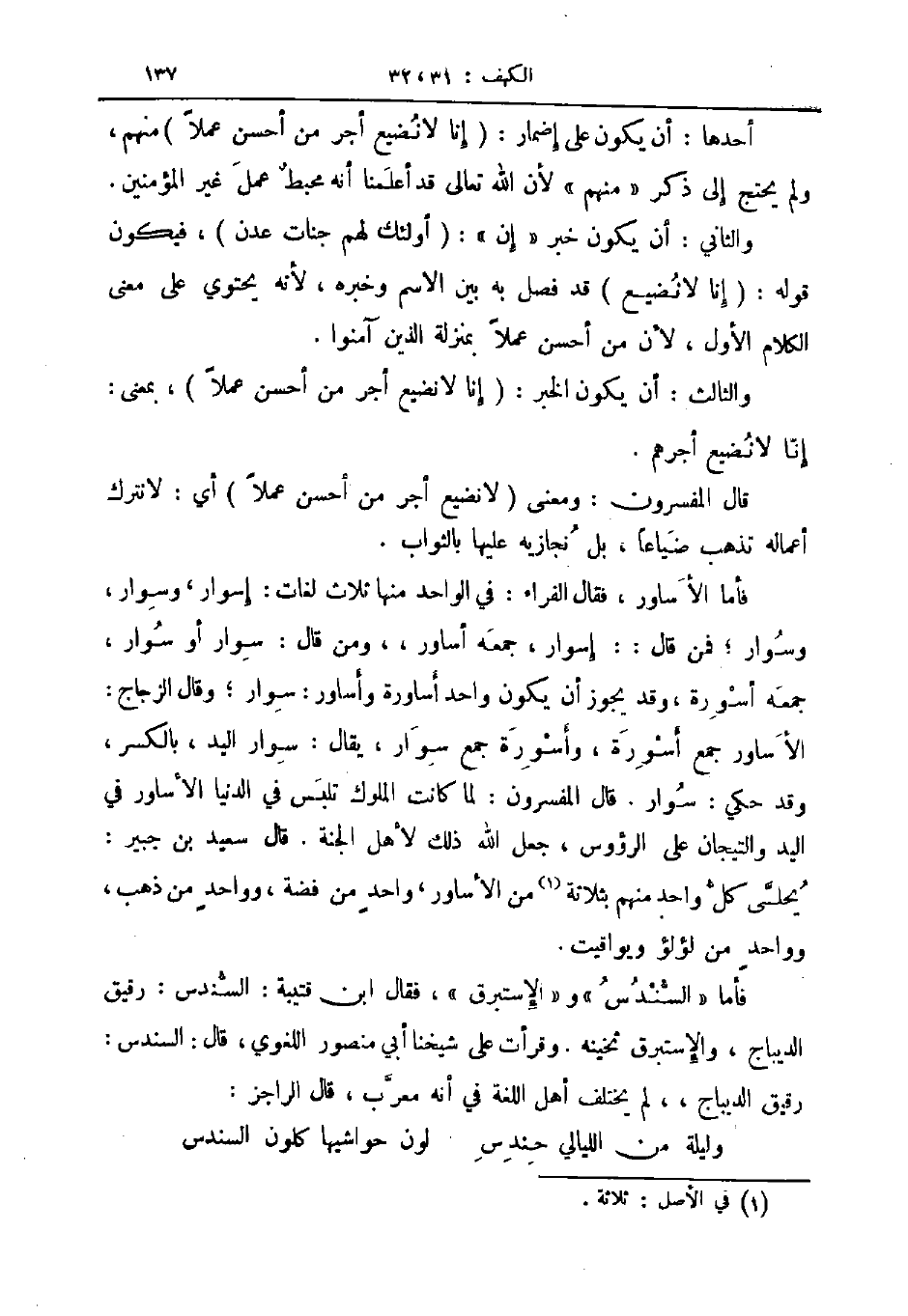فأما الأساور فقال الفراء في الواحد منها ثلاث لغات إسوار وسوار وسوار فمن قال إسوار جمعه أساور ومن قال سوار أو سوار جمعه أسورة وقد يجوز أن يكون واحد أساورة وأساور وقال الزجاج الأساور جمع أسورة وأسورة جمع سوار يقال سوار اليد بالكسر وقد حكي سوار قال المفسرون لما كانت الملوك تلبس في الدنيا الأساور في اليد والتيجان على الرؤوس جعل الله ذلك لأهل الجنة قال سعيد بن جبير يحلى كل واحد منهم بثلاثة من الأساور واحد من فضة وواحد من ذهب وواحد من لؤلؤ ويواقيت