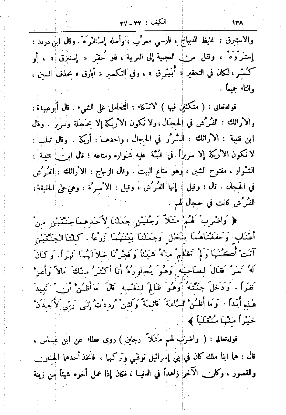قوله تعالى واضرب لهم مثلا رجلين روى عطاء عن ابن عباس قال هما ابنا ملك كان في بني اسرائيل توفي وتركهما فاتخذ أحدهما الجنان والقصور وكان الآخر زاهدا في الدنيا فكان اذا عمل اخوه شيئا من زينة