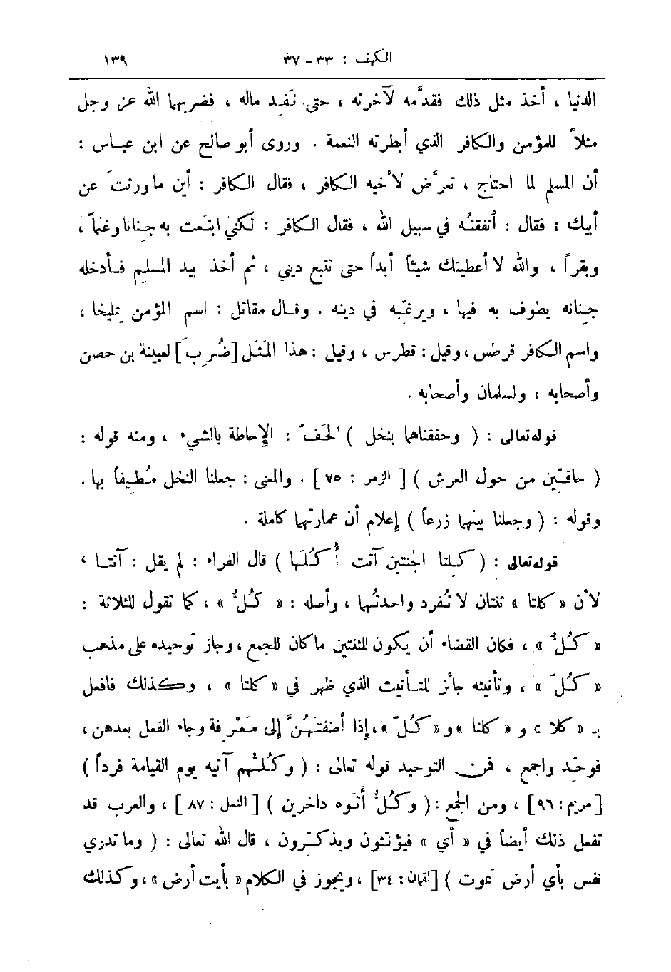 قوله تعالى كلتا الجنتين آتت أكلها قال الفراء لم يقل آتتا لأن كلتا ثنتان لا تفرد واحدتهما وأصله كل كما تقول للثلاثة كل فكان القضاء أن يكون للثنتين ما كان للجمع وجاز توحيده على مذهب كل وتأنيثه جائز للتأنيث الذي ظهر في كلتا وكذلك فافعل ب كلا وكلتا وكل إذا اضفتهن الى معرفة وجاء الفعل بعدهن فوحد واجمع فمن التوحيد قوله تعالى وكلهم آتيه يوم القيامة فردا مريم 96 ومن الجمع وكل أتوه داخرين النمل 87 والعرب قد تفعل أيضا في أي فيؤنثون ويذكرون قال الله تعالى وما تدري نفس بأي أرض تموت لقمان 34 ويجوز في الكام بأيت أرض وكذلك