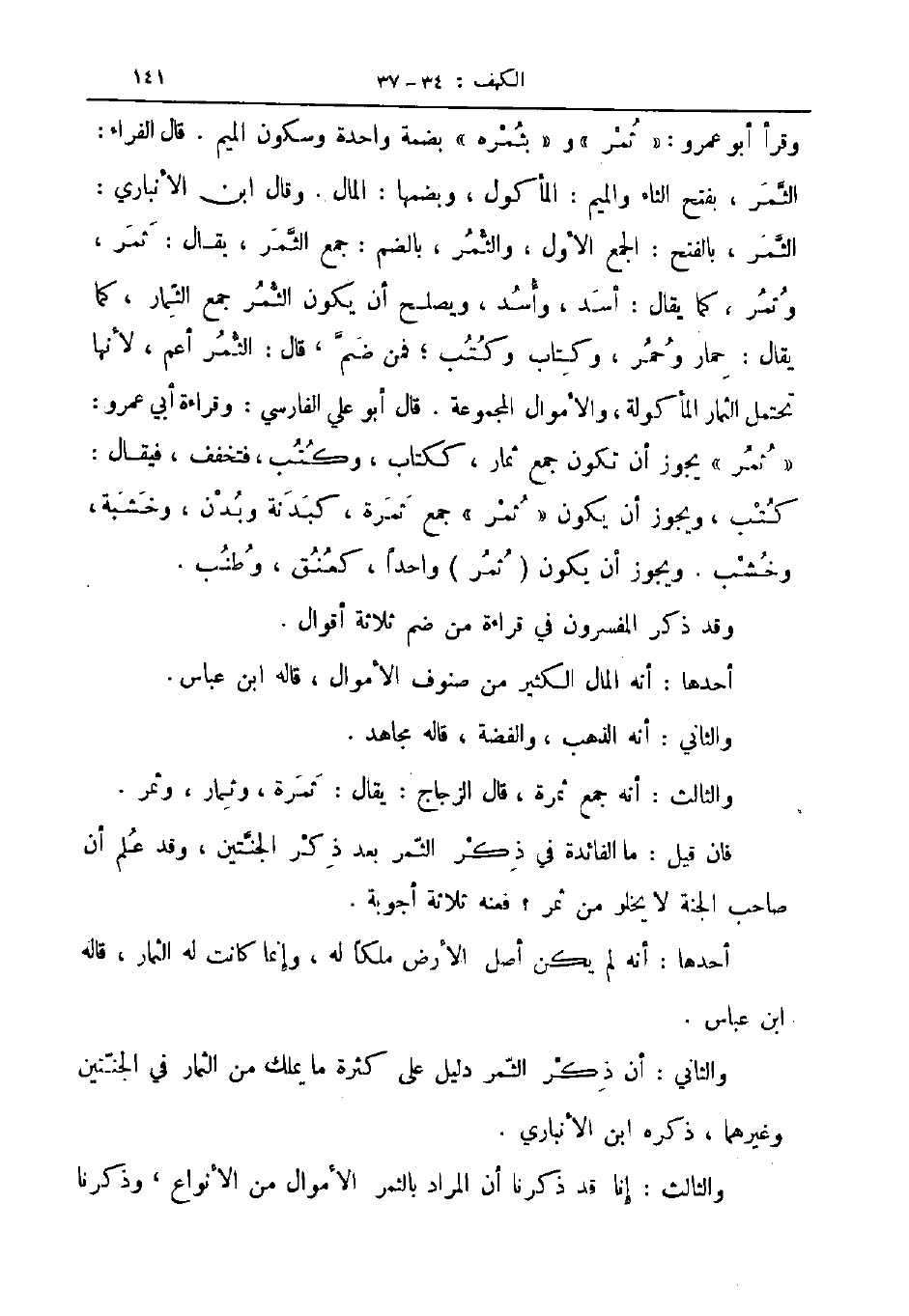 والثاني أن ذكر الثمر دليل على كثرة ما يملك من الثمار في الجنتين وغيرهما ذكره ابب الأنباري