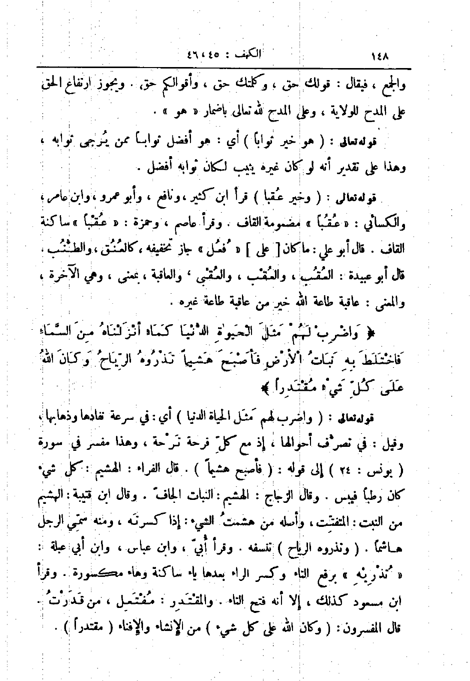 قوله تعالى واضرب لهم مثل الحياة الدنيا أي في سرعة نفادها وذهابها وقيل في تصرف احوالها إذ مع كل فرحة ترحة وهذا مفسر في سورة يونس 24 إلى قوله فأصبح هشيما قال الفراء الهشيم كل شيء كان رطبا فيبس وقال الزجاج الهشيم النبات الجاف وقال ابن قتيبة الهشيم من النبت المتفتت وأصله من هشمت الشيء إذا كسرته ومنه سمي الرجل هاشما وتذروه الرياح تنسفه وقرأ أبي وابن عباس وابن أبي عبلة تذريه برفع التاء وكسر الراء بعدها ياء ساكنة وهاء مكسورة وقرأ ابن مسعود كذلك إلا أنه فتح التاء والمقتدر مفتعل من قدرت قال المفسرون وكان الله على كل شيء من الإنشاء والإفناء مقتدرا