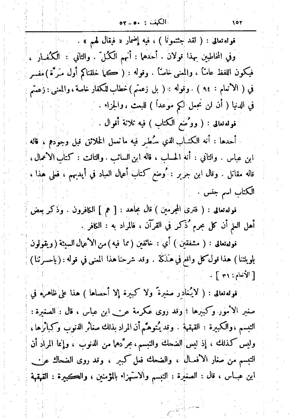 قوله تعالى لا يغادر صغيرة ولا كبيرة إلا احصاها هذا على ظاهره في صغير الأمور وكبيرها وقد روى عكرمة عن ابن عباس قال الصغيرة التبسم والكبيرة القهقهة وقد يتوهم أن المراد بذلك صغائر الذنوب وكبائرها وليس كذلك إذ ليس الضحك والتبسم مجردهما من الذنوب وإنما المراد أن التبسم من صغار الأفعال والضحك فعل كبير وقد روى الضحاك عن ابن عباس قال الضغيرة التبسم والاستهزاء بالمؤمنين والكبيرة القهقهة