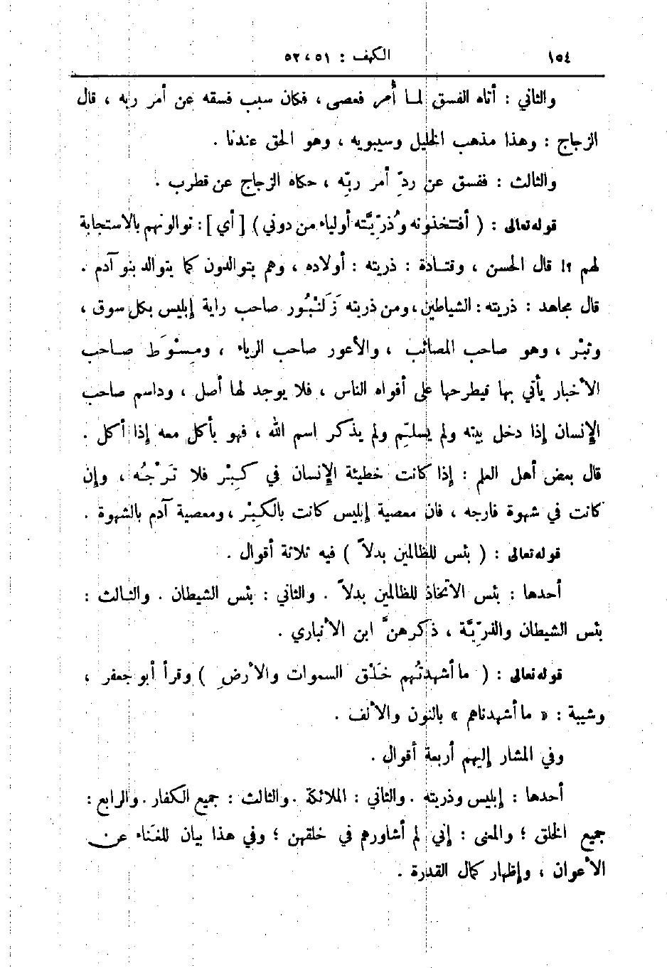 قوله تعالى أفتخذونه وذريته اولياء من دوني أي توالونهم بالاستجابة لهم قال الحسن وقتادة ذريته أولاده وهم يتوالدون كما يتوالد بنو آدم قال مجاهد ذريته الشياطين ومن ذريته زلنبور صاحب راية ابليس بكل سوق وثبر وهو صاحب المصائب والأعور صاحب الرياء ومسوط صاحب الأخبار يأتي بها فيطرحها على أفواه الناس فلا يوجد لها اصل وداسم صاحب الإنسان إذا دخل بيته ولم يسلم ولم يذكر اسم الله فهو يأكل معه إذا أكل قال بعض أهل العلم إذا كانت خطئية الانسان في كبر فلا ترجه وإن كانت في شهوة فارجه فان معصية إبليس كانت بالكبر ومعصية آدم بالشهوة