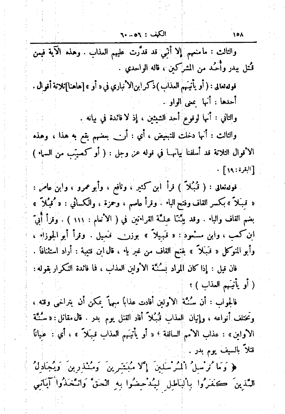 قوله تعالى قبلا قرأ ابن كثير ونافع وأبو عمرو وابن عامر قبلا بكسر القاف وفتح الباء وقرأ عاصم وحمزة والكسائي قبلا بضم القاف والباء وقد بينا علة القراءتين في الأنعام 111 وقرأ أبي ابن كعب قبلا بفتح القاف من غير ياء قال ابن قتيبة أراد استئنافا