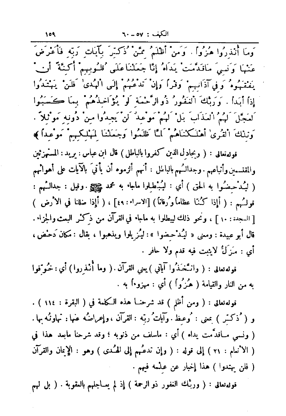 قوله تعالى ومن أظلم قد شرحنا هذه الكلمة في البقرة 114 وذكر بمعنى وعظ وآيات ربه القرآن وأعراضه عنها تهاونه بها ونسي ما قدمت يداه أي ما سلف من ذنوبه وقد شرحنا ما بعد هذا في الأنعام 21 إلى قوله وإن تدعهم إلى الهدى وهو الإيمان والقرآن فلن يهتدوا هذا اخبار عن علمه فيهم