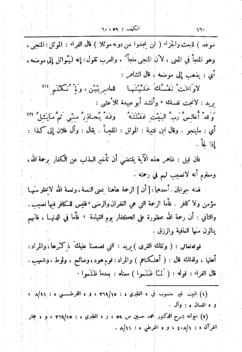 موعد للبعث والجزاء لن يجدوا من دونه موئلا قال الفراء الموئل المنجى وهو الملجأ في المعنى لأن المنجي ملجأ والعرب تقول إنه ليوائل إلى موضعه أي يذهب الى موضعه قال الشاعر ... لاواءلت نفسك خليتها ... للعامريين ولم تكلم ...