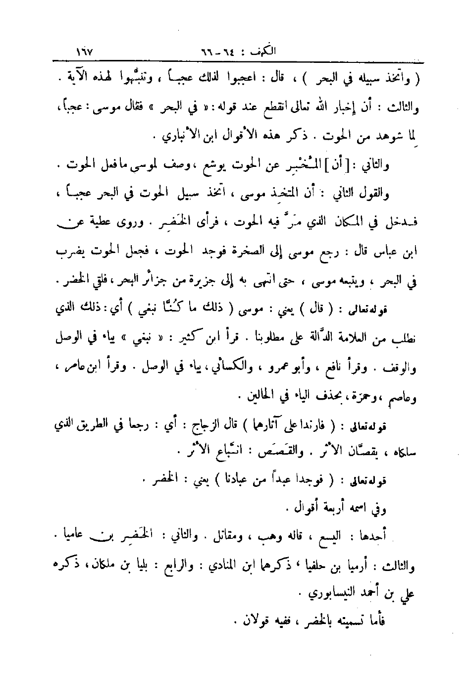 والقول الثاني أن المتخذ موسى اتخذ سبيل الحوت في البحر عجبا فدخل في المكان الذي مر فيه الحوت فرأى الخضر وروى عطية عن ابن عباس قال رجع موسى الى الصخرة فوجد الحوت فجعل الحوت يضرب في البحر ويتبعه موسى حتى انتهى به الى جزيرة من جزائر البحر فلقي الخضر
