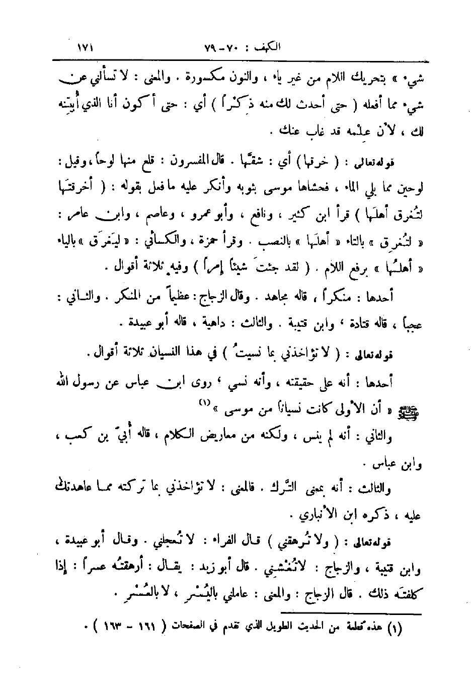قوله تعالى خرقها أي شقها قال المفسرون قلع منها لوحا وقيل لوحين مما يلي الماء فحشاها موسى بثوبه وأنكر عليه ما فعل بقوله أخرقتها لتغرق أهلها قرأ ابن كثير ونافع وأبو عمرو وعاصم وابن عامر لتغرق بالتاء أهلها بالنصب وقرأ حمزة والكسائي ليغرق بالياء أهلها برفع اللام لقد جئت شيئا إمرا وفيه ثلاثة أقوال