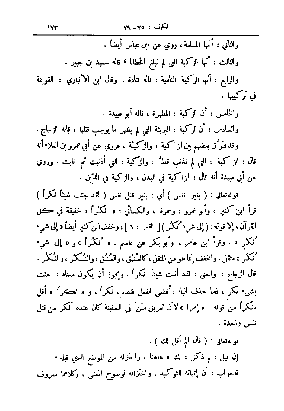 وقد فرق بعضهم بين الزاكية والزكية فروي عن ابي عمرو بن العلاء أنه قال الزاكية التي لم تذنب قط والزكية التي أذنبت ثم تابت وروي عن أبي عبيدة أنه قال الزاكية في البدن والزكية في الدين