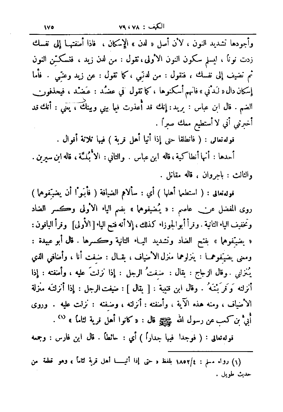 قوله تعالى استطعما أهلها أي سألاهم الضيافة فأبوا أن يضيفوهما روى المفضل عن عاصم يضيفوهما بضم الياء الأولى وكسر الضاد وتخفيف الياء الثانية وقرأ أبو الجوزاء كذلك إلا أنه فتح الياء الأولى وقرأ الباقون يضيفوها بفتح الضاد وتشديد الياء الثانية وكسرها قال أبو عبيدة ومعنى يضيفوهما ينزلوهما منزل الأضياف يقال ضفت أنا وأضافي الذي ينزلني وقال الزجاج يقال ضفت الرجل إذا نزلت عليه وأضفته إذا أنزلته وقريته وقال ابن قتيبة يقال ضيفت الرجل إذا أنزلته منزلة الأضياف ومنه هذه الآية وأضفته أنزلته وضفته نزلت عليه وروى أبي بن كعب عن رسول الله صلى الله عليه و سلم قال كانوا أهل قرية لئاما