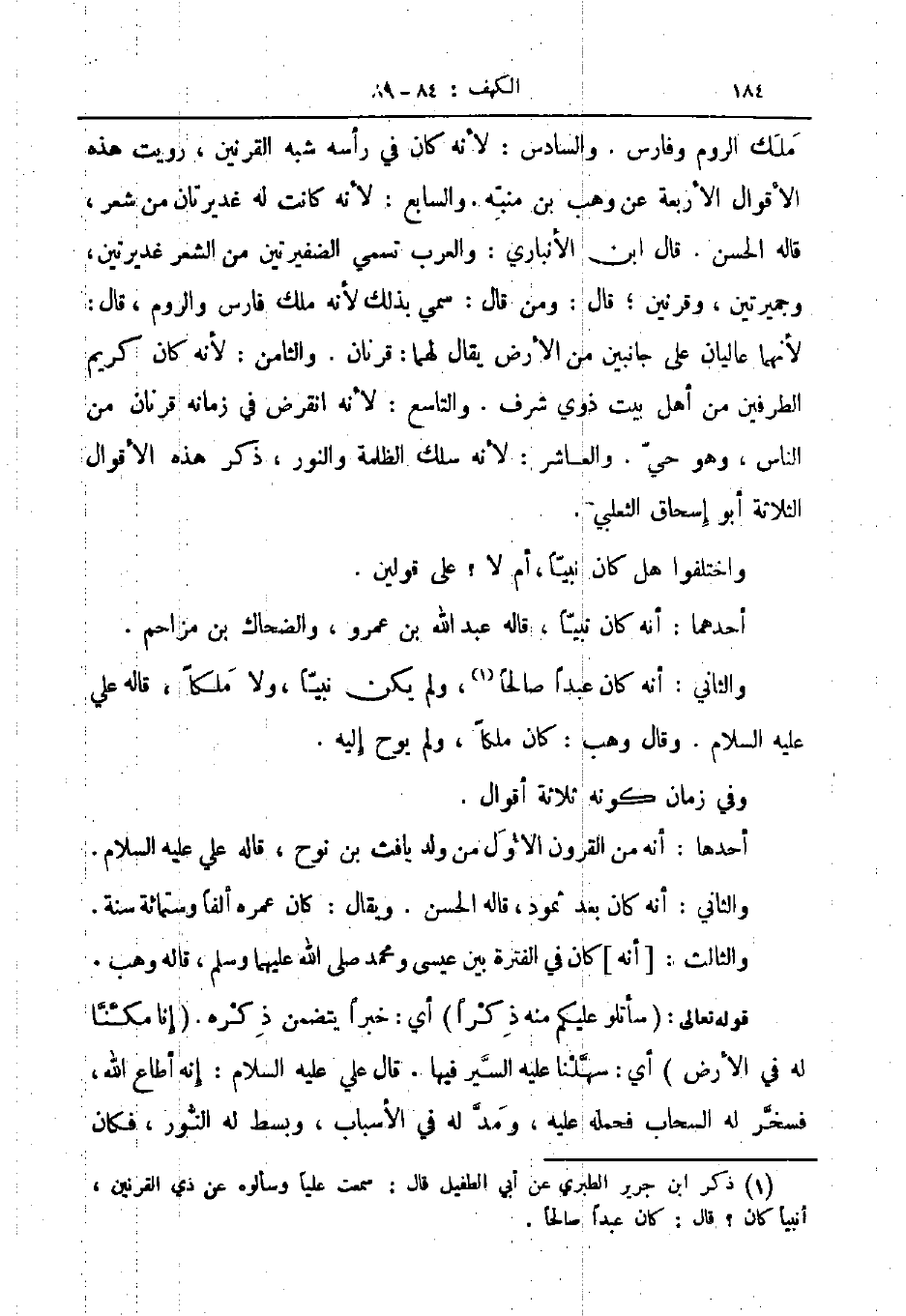 ملك الروم وفارس والسادس لأنه كان في رأسه شبه القرنين رويت هذه الأقوال الأربعة عن وهب بن منبه والسابع لأنه كانت له غديرتان من شعر قاله الحسن قال ابن الأنباري والعرب تسمي الضفيرتين من الشعر غديرتين وجميرتين وقرنين قال ومن قال سمي بذلك لأنه ملك فارس والروم قال لأنهما عاليان على جانبين من الأرض يقال لهما قرنان والثامن لأنه كان كريم الطرفين من اهل بيت ذوي شرف والتاسع لأنه انقرض في زمانه قرنان من الناس وهو حي والعاشر لأنه سلك الظلمة والنور ذكر هذه الأقوال الثلاثة أبو اسحاق الثعلبي