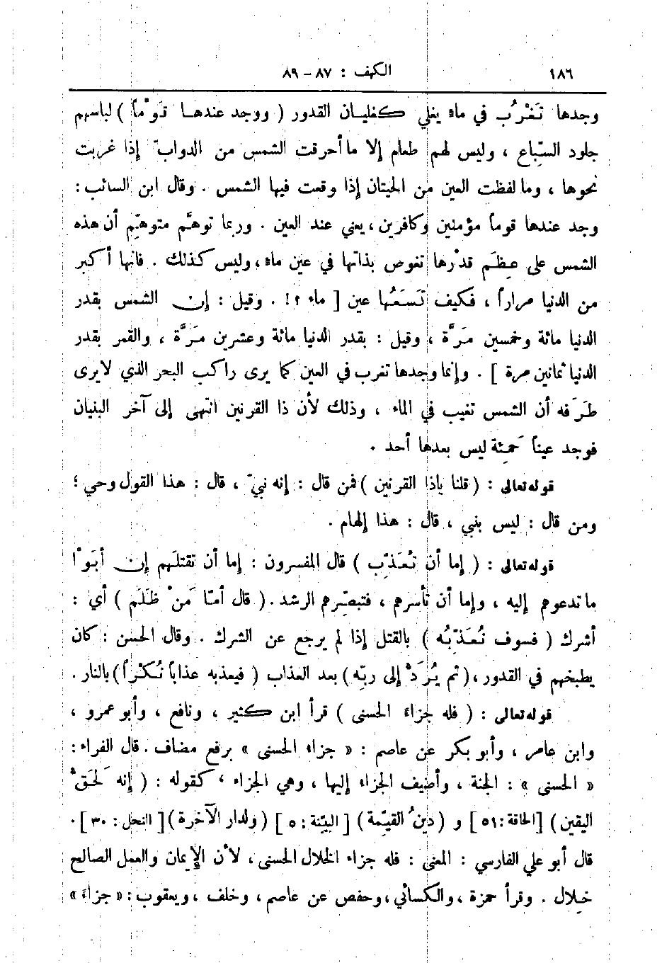 وجدها تغرب في ماء يغلي كغليان القدور ووجد عندها قوما لباسهم جلود السباع وليس لهم طعام إلأا ما أحرقت الشمس من الدواب إذا غربت نحوها وما لفظت العين من الحيتان إذا وقعت فيها الشمس وقال ابن السائب وجد عندها قوما مؤمنين وكافرين يعني عند العين وربما توهم متوهم أن هذه الشمس على عظم قدرها تغوص بذاتها في عين ماء وليس كذلك فانها أكبر من الدنيا مرارا فكيف تسعها عين ماء وقيل إن الشمس بقدر الدنيا مائة وخمسين مرة وقيل بقدر الدنيا مائة وعشرين مرة والقمر بقدر الدنيا ثمانين مرة وإنما وجدها تغرب في العين كما يرى راكب البحر الذي لا يرى طرفه ان الشمس تغيب في الماء وذلك لأن ذا القرنين أنتهى الى آخر البنيان فوجد عينا حمئة ليس بعدها أحد