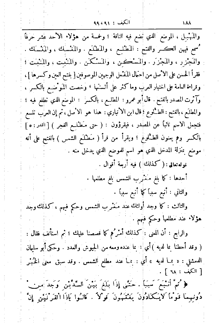 والمهبل الموضع الذي تضع فيه الناقة وخمسة من هؤلاء الأحد عشر حرفا سمع فيهن الكسر والفتح المطلع والمطلع والمنسك والمنسك والمجزر والمجزر والمسكن والمسكن والمنبت والمنبت فقرا الحسن على الأصل من احتمال المفعل الوجهين الموصوفين بفتح العين وكسرها وقراءة العامة على اختيار العرب وما كثر على ألسنتها وخصت الموضع بالكسر وآثرت المصدر بالفتح قال أبو عمرو المطلع بالكسر الموضع الذي تطلع فيه والمطلع بالتفح الطلوع قال ابن الأنباري هذا هو الأصل ثم إن العرب تتسع فتجعل الاسم نائبا عن المصدر فيقرؤون حتى مطلع الفجر القدر 5 بالكسر وهم يعنون الطلوع ويقرأ من قرأ مطلع الشمس بالفتح على أنه موضع بمنزلة المدخل الذي هو اسم للموضع الذي يدخل منه