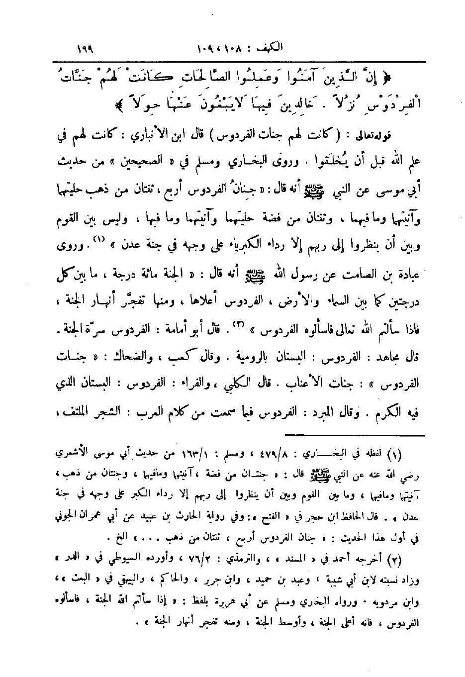 قوله تعالى كانت لهم جنات الفردوس قال ابن الأنباري كانت لهم في علم الله قبل أن يخلقوا وروى البخاري ومسلم في الصحيحين من حديث أبي موسى عن النبي صلى الله عليه و سلم أنه قال جنان الفردوس أربع ثنتان من ذهب حليتهما وآنيتهما وما فيهما وثنتان من فضة حليتهما وآنيتهما وما فيها وليس بين القوم وبين ان ينظروا الى ربهم الا رداء الكبرياء على وجهه في جنة عدن وروى عبادة بن الصامت عن رسول الله ص - انه قال الجنة مائة درجة ما بين كل درجتين كما بين السماء والأرض الفردوس أعلاها ومنها تفجر أنهار الجنة فاذا سألتم الله تعالى فاسألوه الفردوس قال أبو أمامة الفردوس سره الجنة قال مجاهد الفردوس البستان بالرومية وقال كعب والضحاك جنات الفردوس جنات الأعناب قال الكلبي والفراء الفردوس البستان الذي فيه الكرم وقال المبرد الفردوس فيما سمعت من كلام العرب الشجر المتلف