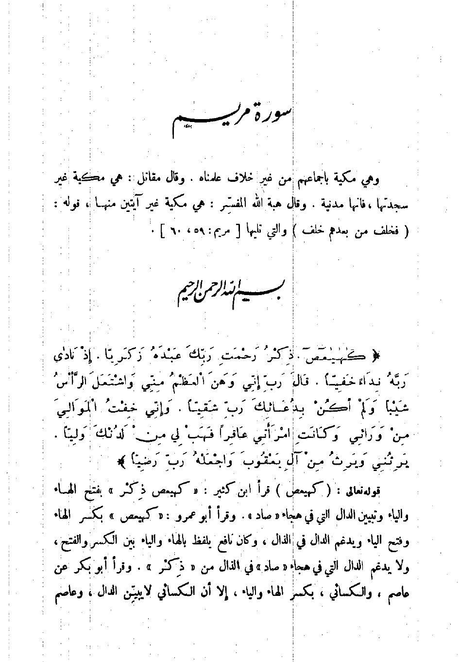 قوله تعالى كهيعص قرأ ابن كثير كهيعص ذكر بفتح الهاء والياء وتبيين الدال التي في هجاء صاد وقرأ ابو عمرو كهيعص بكسر الهاء وفتح الياء ويدغم الدال في الذال وكان نافع بالهاء يلفظ والياء بين الكسر والفتح ولا يدغم الدال التي في هجاء صاد في الذال من ذكر وقرأ ابو بكر عن عاصم والكسائي بكسر الهاء والياء إلا أن الكسائي لا يبين الدال وعاصم