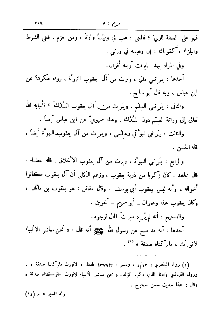 والثاني يرثي العلم ويرث من آل يعقوب الملك فأجابه الله تعالى إلى وراثة العلم دون الملك وهذا مروي عن ابن عباس أيضا