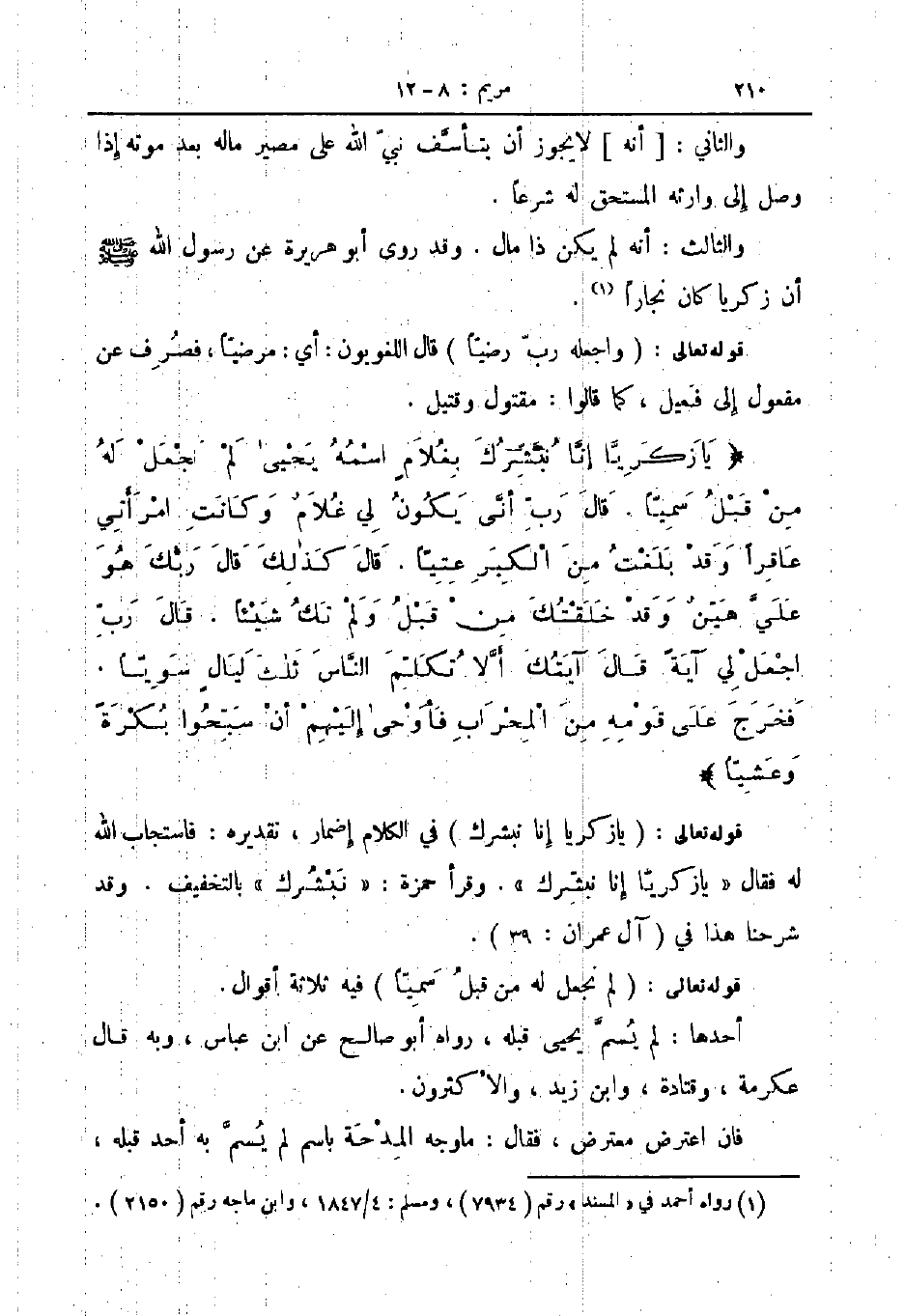 يا زكريا إنا نبشرك بغلام اسمه يحيى لم نجعل له من قبل سميا قال رب أنى يكون لي غلام وكانت امراتي عاقرا وقد بلغت من الكبر عتيا قال كذلك قال ربك هو علي هين وقد خلقتك من قبل ولم تك شيئا قال رب اجعل لي آية قال آيتك ألا تكلم الناس ثلث ليال سويا فخرج علي قومه من المحراب فأوحى اليهم ان سبحوا بكرة وعشيا