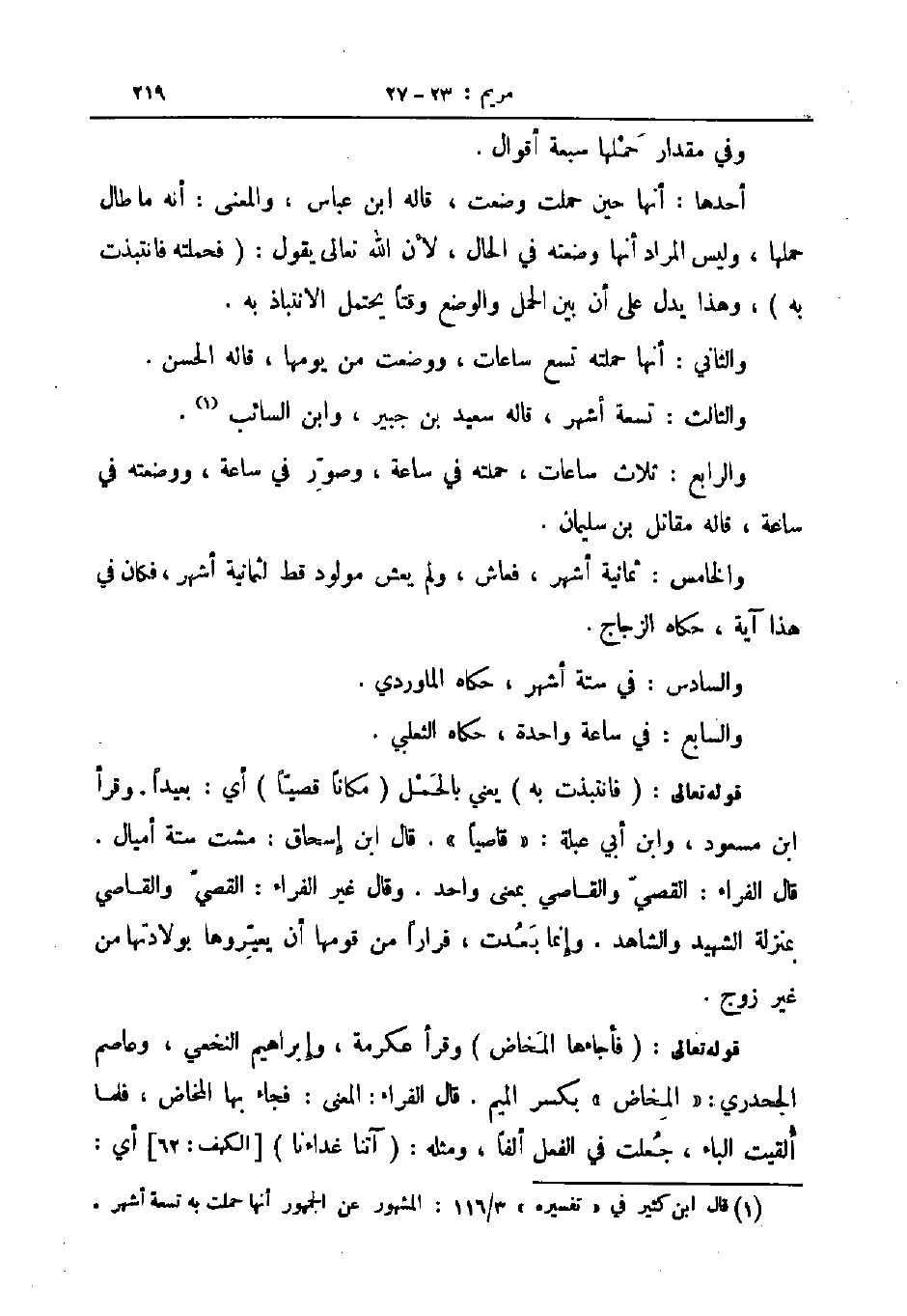 أحدها انها حين حملت وضعت قاله ابن عباس والمعنى أنه ما طال حملها وليس المراد أنها وضعته في الحال لأن الله تعالى يقول فحملته فانتبذت به وهذا يدل على أن بين الحمل والوضع وقتا يحتمل الانتباذ به