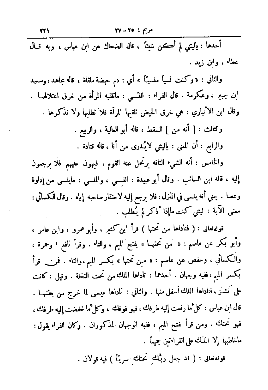 والثاني وكنت نسيا منسيا أي دم حيضة ملقاة قاله مجهد وسعيد ابن جبير وعكرمة قال الفراء النسي ما تلقيه المرأة من خرق اعتلالها وقال ابن الأنباري هي خرق الحيض تلقيها المرأة فلا تطلبها ولا تذكرها