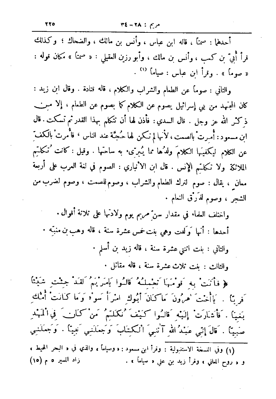 والثاني صوما عن الطعام والشراب والكلام قاله قتادة وقال ابن زيد كان المجتهد من بني اسرائيل يصوم عن الكلام كما يصوم عن الطعام الا من ذكر الله عز و جل قال السدي فأذن لها أن تتكلم بهذا القدر ثم تسكت قال ابن مسعود أمرت بالصمت لأنها لم تكن لها حجة عند الناس فأمرت بالكف عن الكلام ليكفيها الكلام ولدها مما يبرئ بها ساحتها فأمرت بالكف عن الكلام ليكفيها الكلام ولدها مما يبرئ به ساحتها وقيل كانت تكلم الملائكة ولا تكلم الإنس قال ابن الأنباري الصوم في لغة العرب على أربعة معان يقال يوم لترك الطعام والشراب وصوم للصمت صوم لضرب من الشجر وصوم لذرق النعام