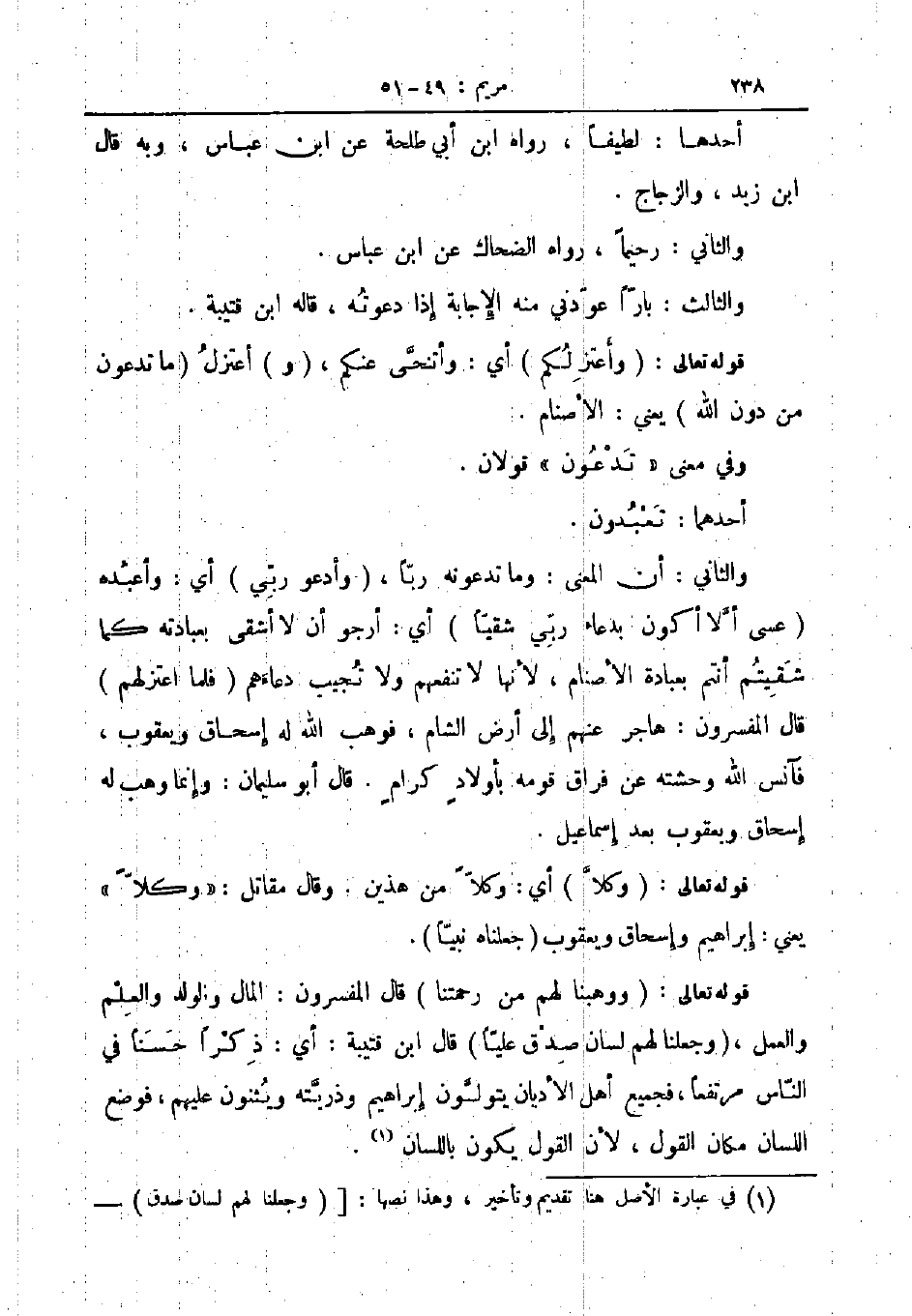 والثاني أن المعنى وما تدعونه ربا وأدعو ربي أي وأعبده عسى ألا أكون بدعاء ربي شقيا أي أرجو أن لا أشقى بعبادته كما شقيتم أنتم بعبادة الأصنام لأنها لا تنفعهم ولا تجيب دعاءهم فلما اعتزلهم قال المفسرون هاجر عنهم الى ارض الشام فوهب الله له اسحاق ويعقوب فآنس الله وحشته عن فراق قومه بأولاد كرام قال أبو سليمان وإنما وهب له اسحاق ويعقوب بعد اسماعيل