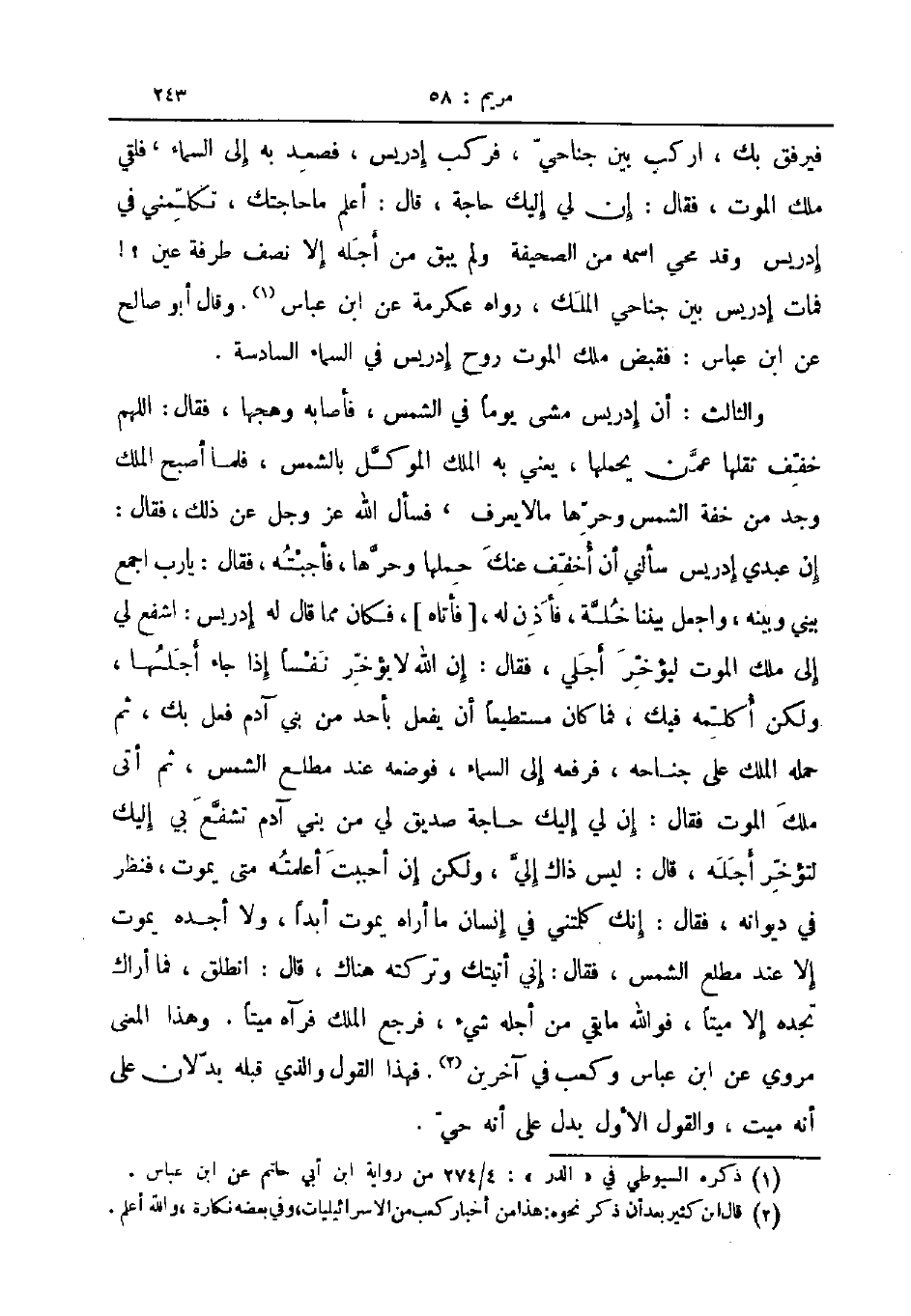 والثالث أن ادريس مشى يوما في الشمس فأصباه وهجها فقال اللهم خفف ثقلها عمن يحملها يعني به الملك الموكل بالشمس فلما أصبح الملك وجد من خفة الشمس وحرها مالا يعرف فسأل الله عز و جل عن ذلك فقال إن عبدي إدريس سألني أن اخفف عنك حملها وحرها فأجبته فقال يا رب أجمع بيني وبينه وأجعل بيننا خلة فأذن له فأتاه فكان مما قال له إدريس اشفع لي الى ملك الموت ليؤخر أجلي فقال إن الله لا يؤخر نفسا إذا جاء أجلها ولكن أكلمه فيك فما كان مستطيعا أن يفعل بأحد من بني آدم فعل بك ثم حمله الملك على جناحه فرفعه الى السماء فوضعه عند مطلع الشمس ثم أتى ملك الموت فقال إن لي إليك حاجة صديق لي من بني آدم تشفع بي إليك لتؤخر أجله قال ليس ذاك إلي ولكن إن أحببت أعلمته متى يموت فنظر في ديوانه فقال إنك كلمتني في إنسان ما أراه يموت أبدا ولا أجده يموت إلا عند مطلع الشمس فقال إني أتيتك وتركته هناك قال انطلق فما أراك تجده إلا ميتا فوالله ما بقي من أجله شيء فرجع الملك فرآه ميتا وهذا المعنى مروي عن الله عباس وكعب في آخرين فهذا القول والذي قبله يدلان على أنه ميت والقول الأول يدل على انه حي