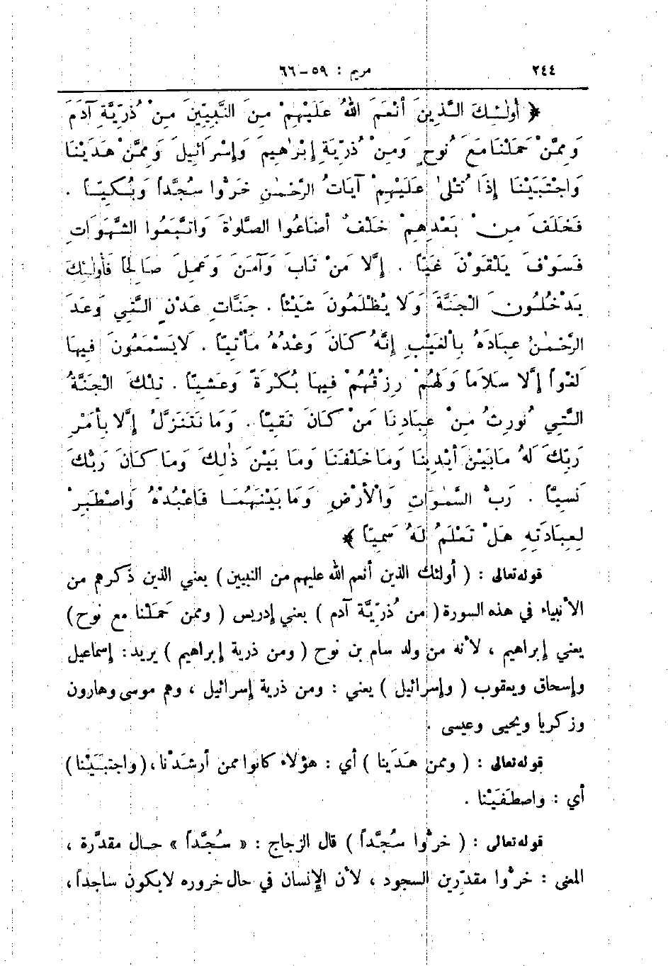 أولئك الذين أنعم الله عليهم من النبيين من ذرية آدم وممن حملنا مع نوح من ذرية إبراهيم وإسرائيل وممن هدينا واجتبينا إذا تتلى عليهم آيات الرحمن خروا سجدا وبكيا فخلف من بعدهم خلف أضاعوا الصلوة واتبعوا الشهوات فسوف يلقون غيا إلا من تاب وآمن وعمل صالحا فأولئك يدخلون الجنة ولا يظلمون شيئا جنات عدن التي وعد الرحمن عباده بالغيب إنه كان وعده مأتيا لا يسمعون فيها لغوا إلا سلاما ولهم رزقهم فيها بكرة وعشيا تلك الجنة التي نورث من عبادنا من كان تقيا وما نتنزل الا بأمر ربك له ما بين أيدينا وما خلفنا وما بين ذلك وما كان ربك نسيا رب السموات والأرض وما بينهما فاعبده واصطبر لعبادته هل تعلم له سميا