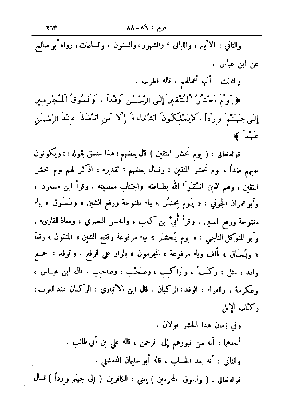 قوله تعالى يوم نحشر المتقين قال بعضهم هذا متعلق بقوله ويكونون عليهم ضدا يوم نحشر المتقين وقال بعضهم تقديره اذكر لهم يوم نحشر المتقين وهم الذين اتقوا الله بطاعته واجتناب معصيته وقرأ ابن مسعود وأبو عمران الجوني يوم يحشر بياء مفتوحة ورفع الشين ويسوق بياء مفتوحة ورفع السين وقرأ ابي بن كعب والحسن البصري ومعاذ القارىء وأبو المتوكل الناجي يوم يحشر بياء مرفوعة وفتح الشين المتقون رفعا ويساق بألف وياء مرفوعة المجرمون بالواو على الرفع والوفد جمع وافد مثل ركب وراكب وصحب وصاحب قال ابن عباس وعكرمة والفراء الوفد الركبان قال ابن الأنباري الركبان عند العرب ركاب الإبل