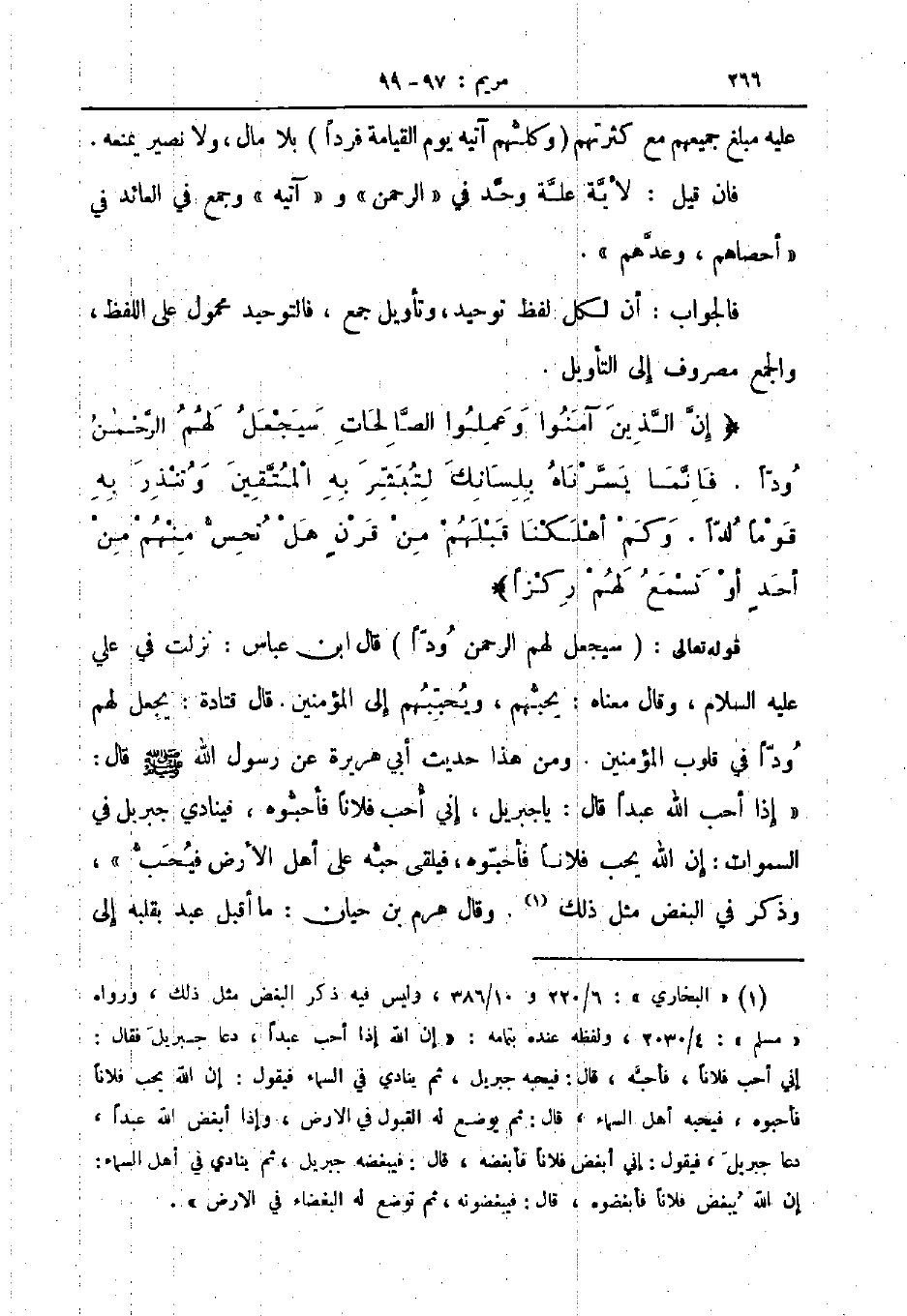 قوله تعالى سيجعل لهم الرحمن ودا قال ابن عباس نزلت في علي عليه السلام وقال معناه يحببهم ويجبهم الى المؤمنين قال قتادة يجعل لهم ودا في قلوب المؤمنين ومن هذا حديث أبي هريرة عن رسول الله صلى الله عليه و سلم قال إذا أحب الله عبدا قال يا جبريل إني أحب فلانا فأحبوه فينادي جبريل في السموات إن الله يحب فلانا فأحبوه فيلقى حبه على أهل الأرض فيحب وذكر في البغض مثل ذلك وقال هرم بن حيان ما اقبل عبد بقلبه الى