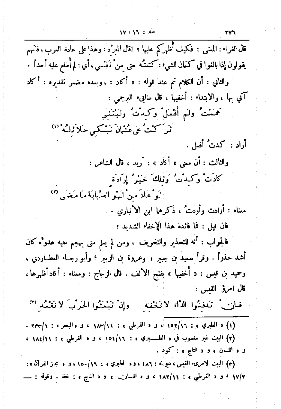 والثالث أن معنى أكاد أريد قال الشاعر ... كادت كدت وتلك خير إرادة ... لو عاد من لهو الصبابة ما مضى ...