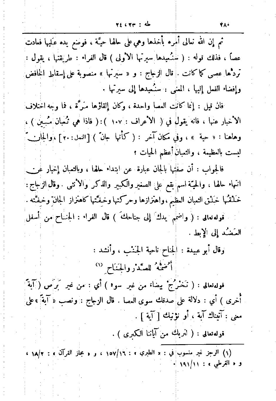 فان قيل إنما كانت العصا واحدة وكان القاؤها مرة فما وجه اختلاف الأخبار عنها فانه يقول في الأعراف 107 فاذا هي ثعبان مبين وهاهنا حية وفي مكان آخر كأنها جان النمل 10 الأصح والجان ليست بالعظيمة والثعبان أعظم الحيات