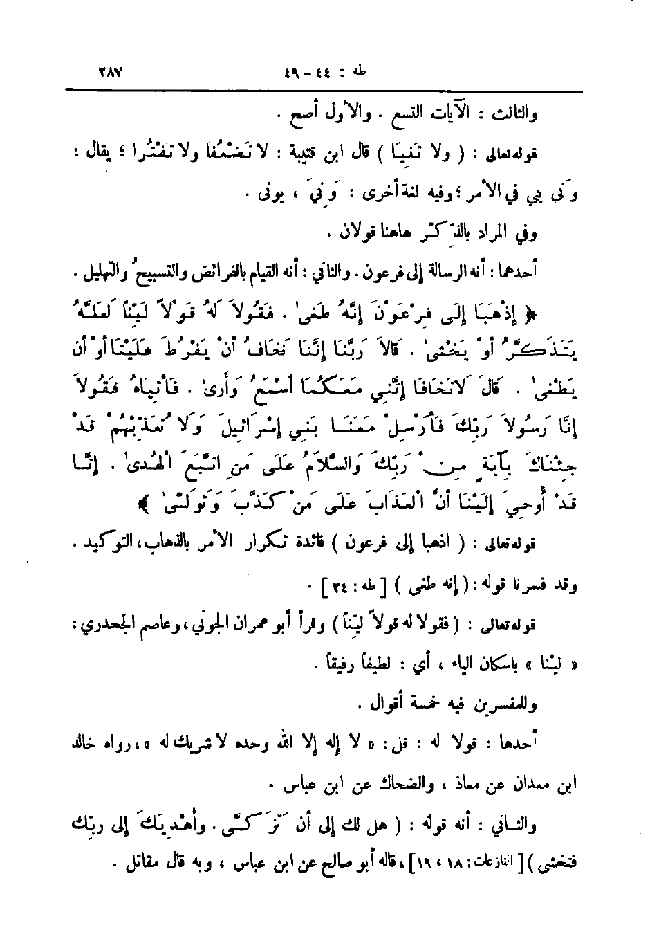 إذهبا الى فرعون إنه طغى فقولا له قولا لينا لعله يتذكر أو يخشى قالا ربنا إننا نخاف أن يفرط علينا أو أن يطغى قال لا تخافا إنني معكما أسمع وأرى فاتياه فقولا إنا رسولا ربك فأرسل معنا بني إسرائيل ولا تعذبهم قد جئناك بآية من ربك والسلام على من اتبع الهدى إنا قد أوحي الينا أن العذاب على من كذب وتولى