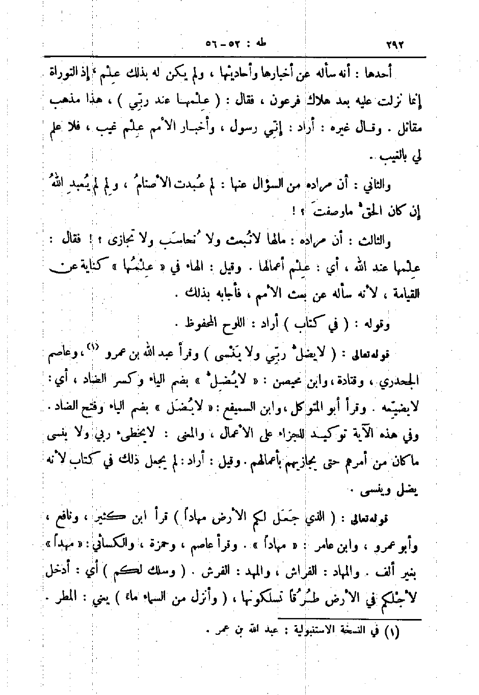 قوله تعالى لا يضل ربي ولا ينسى وقرأ عبد الله بن عمرو وعاصم الجحدري وقتادة وابن محيصن لا يضل بضم الياء وكسر الضاد أي لا يضيعه وقرأ أبو المتوكل وابن السميفع لا يضل بضم الياء وفتح الضاد وفي هذه الآية توكيد للجزاء على الأعمال والمعنى لا يخطئ ربي ولا ينسى ما كان من أمرهم حتى يجازيهم بأعمالهم وقيل أراد لم يجعل ذلك في كتاب لأنه يضل وينسى