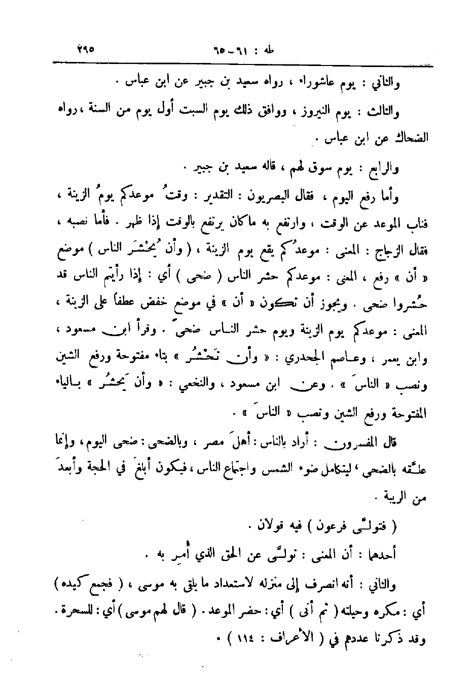 وأما رفع اليوم فقال البصريون التقدير وقت موعدكم يوم الزينة فناب الموعد عن الوقت وارتفع به ما كان يرتفع بالوقت إذا ظهر فأما نصبه فقال الزجاج المعنى موعدكم يقع يوم الزينة وان يحشر الناس موضع أن رفع المعنى موعدكم حشر الناس ضحى أي إذا رأيتم الناس قد حشروا ضحى ويجوز أن تكون أن في موضع خفض عطفا على الزينة المعنى موعدكم يوم الزينة ويوم حشر الناس ضحى وقرأ ابن مسعود وابن يعمر وعاصم الجحدري وأن تحشر بتاء مفتوحة ورفع الشين ونصب الناس وعن ابن مسعود والنخعي وان يحشر بالياء المفتوحة ورفع الشين ونصب الناس